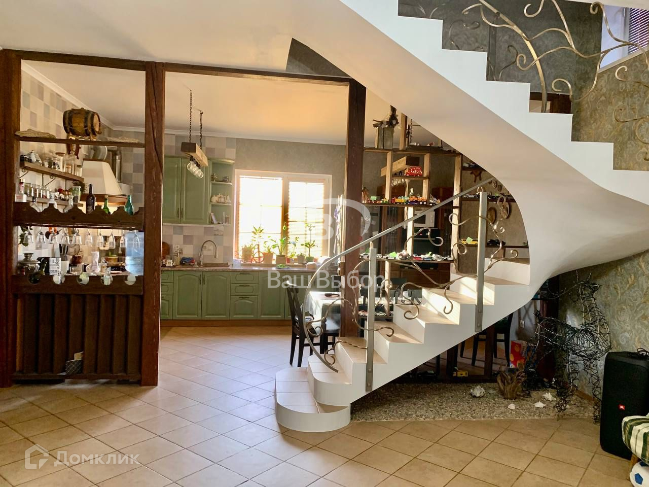 Первый этаж: кухня-столовая, гостиная, санузел с ванной, прихожая, гардероб, прачечная; теплый пол по всему этажу.