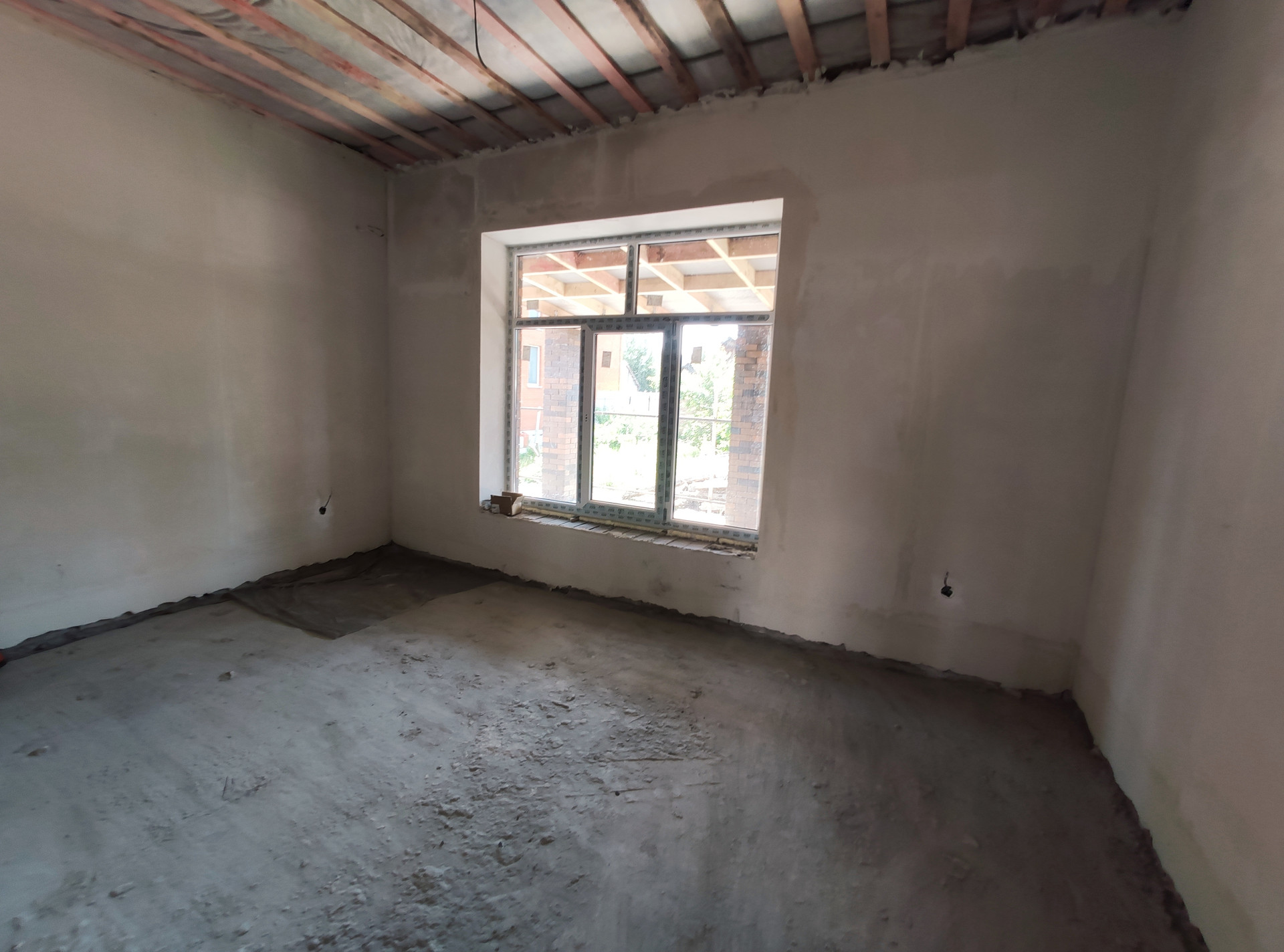 В доме выполнена предчистовая отделка: штукатурка, стяжка, установлены радиаторы отопления и газовый котел.
