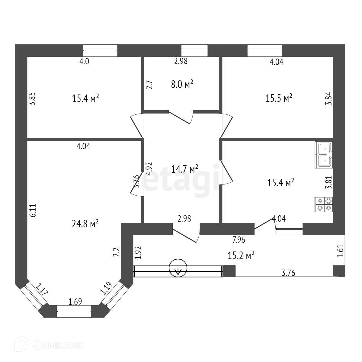 В доме большая кухня 15,4 м2 с выходом на террасу 15 м2, просторная гостиная 25 м2, большой хол 14,7 м2 с возможностью размещения прихожей и шкафов-купе, 2 просторные спальни по 15,5 м2 (можно разместить гардеробные) и большой сан узел 8 м2 с окном (непрозрачное остекление).