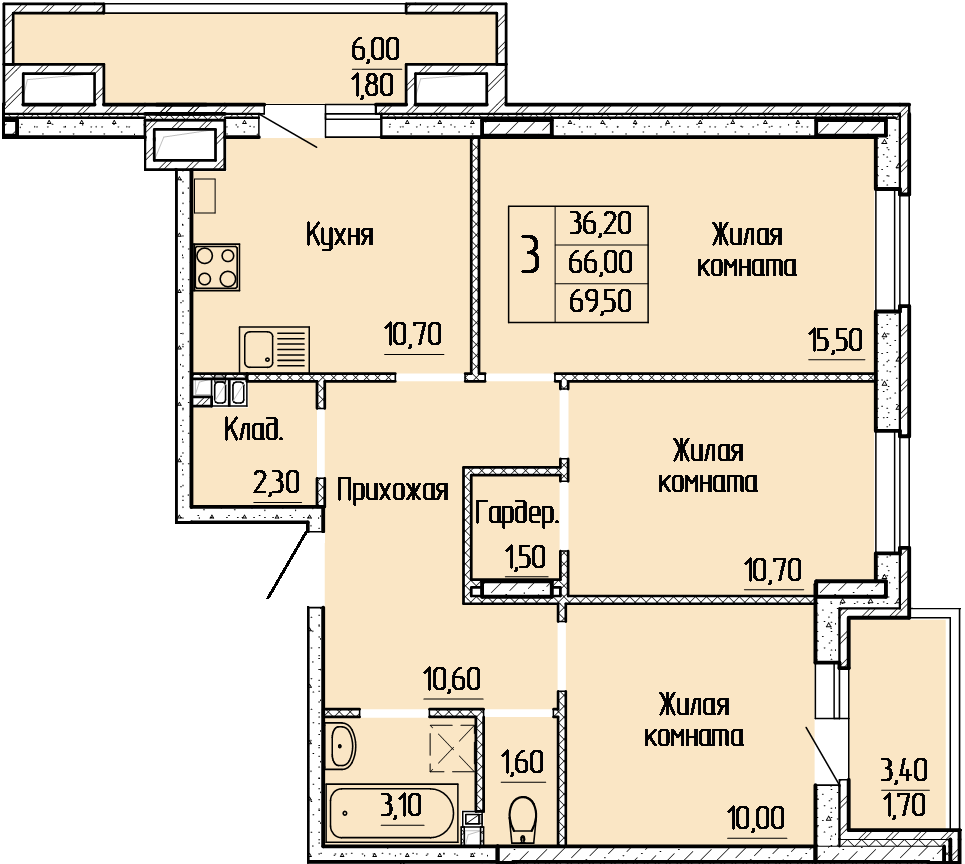 Общая площадь 69.5 м2