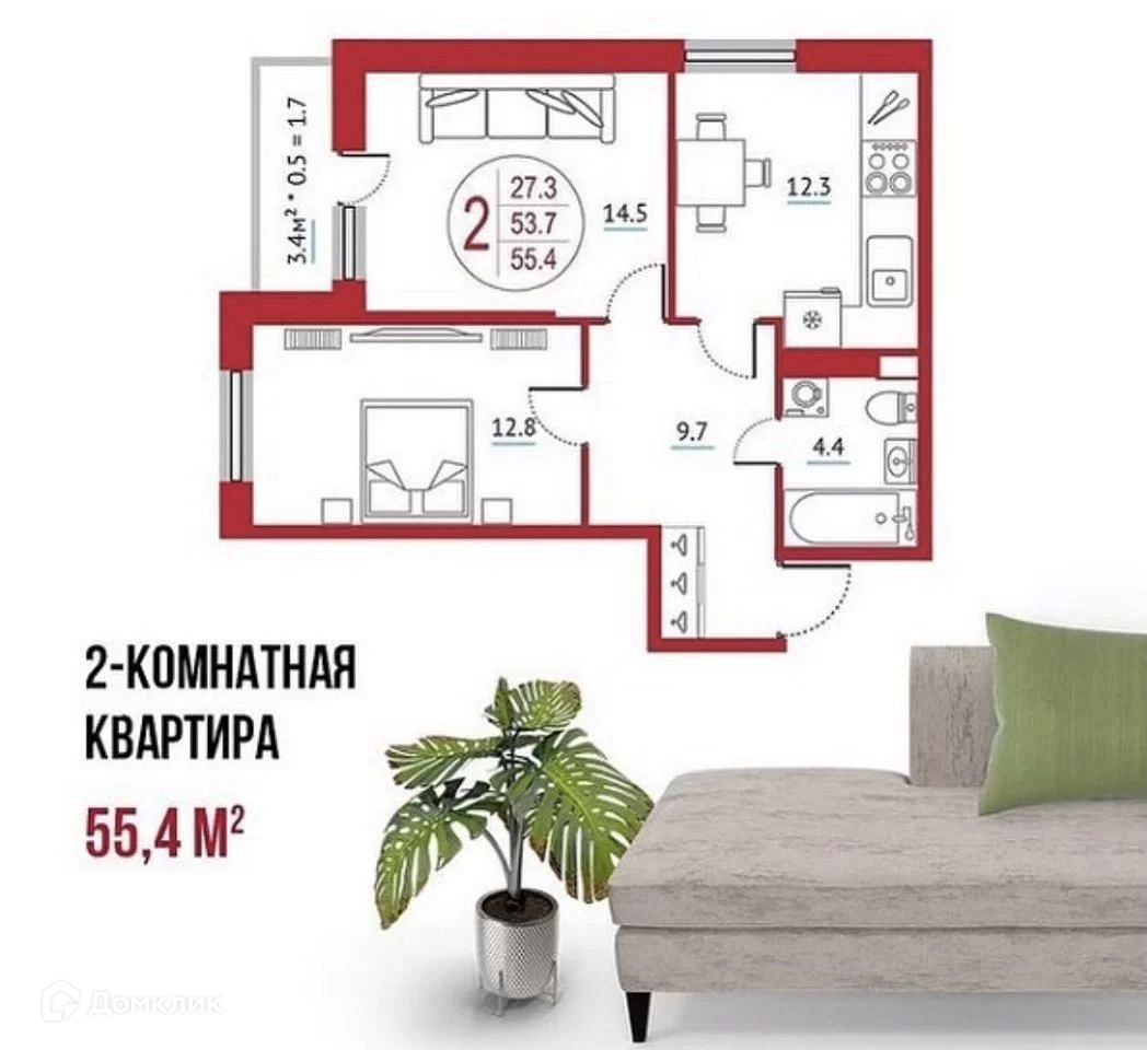 Общая площадь 57 м2