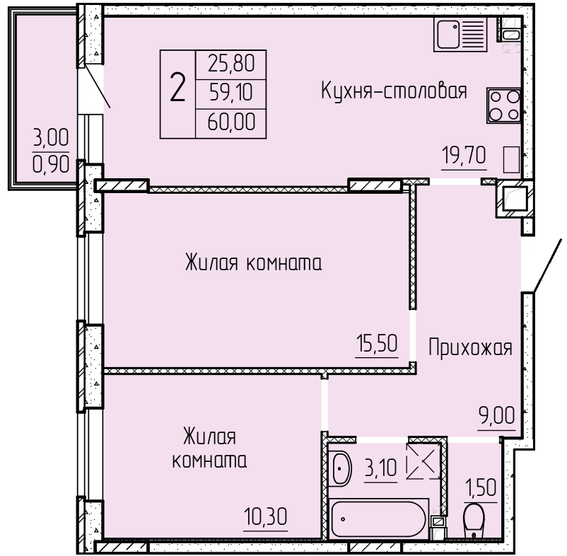 Общая площадь 59.4 м2