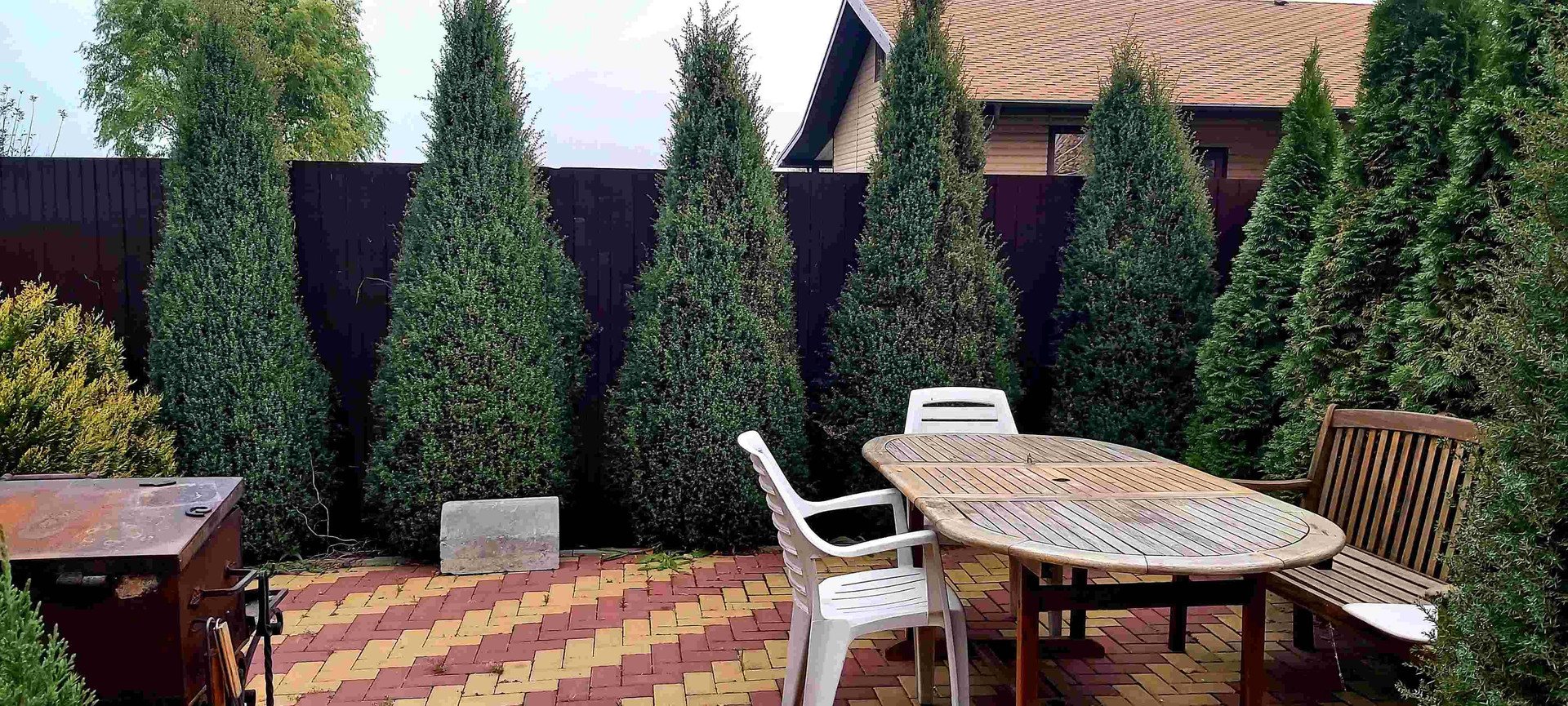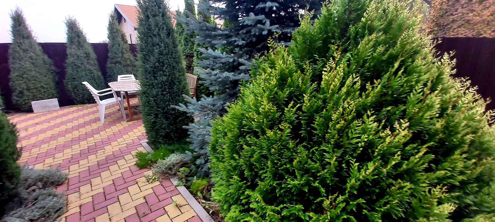 Волшебный дворик, вымощенный разноцветной жизнеутверждающей плиткой, утопающий в зелени и хвойниках.