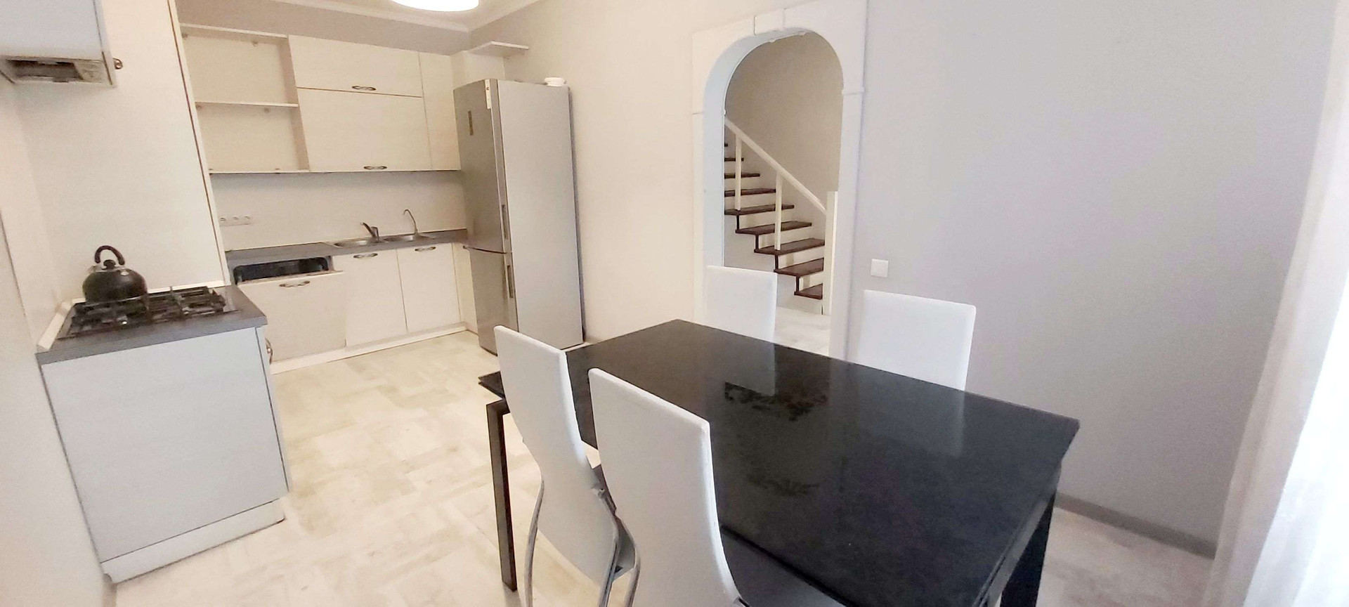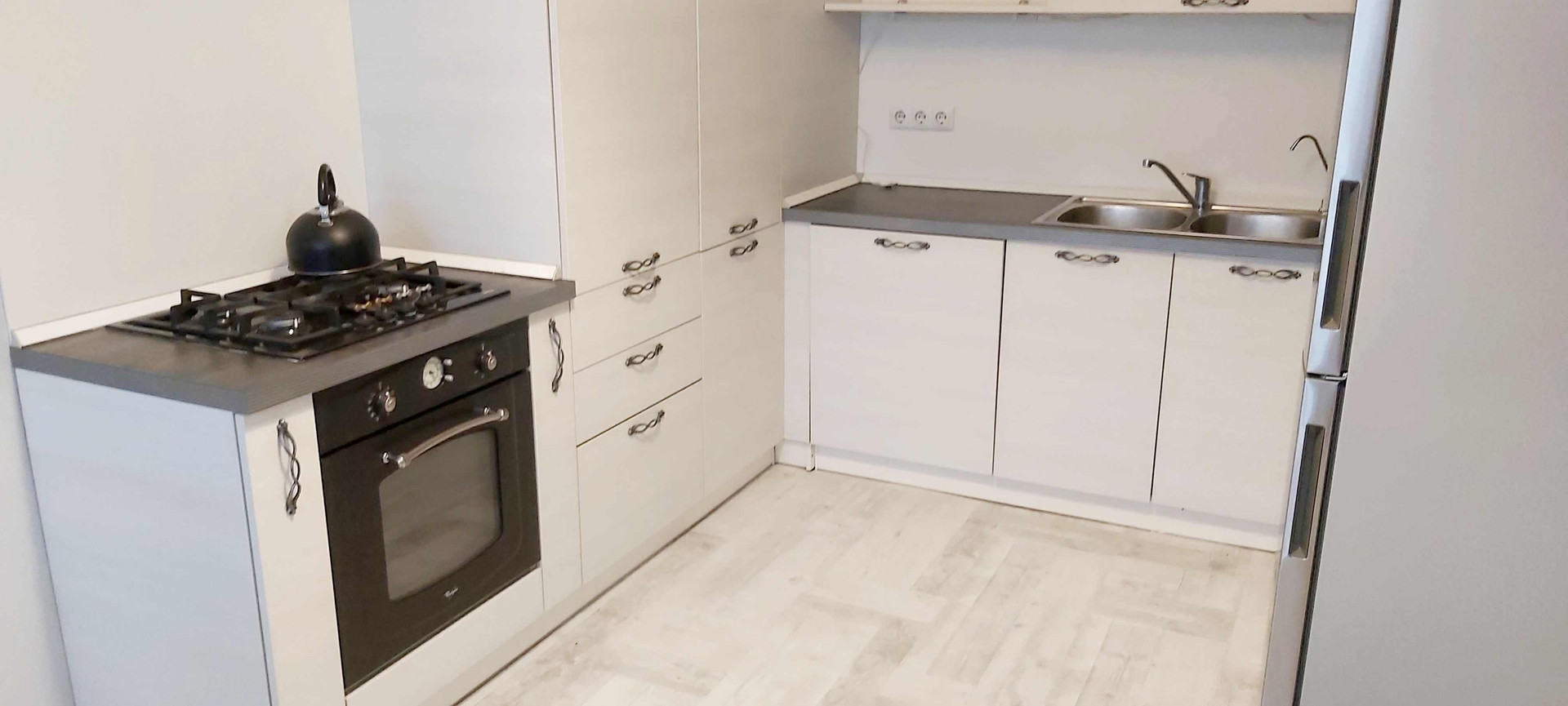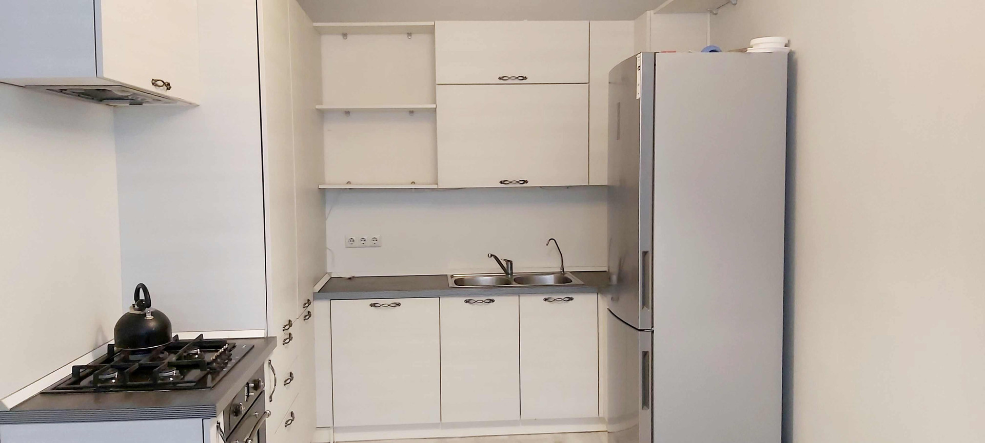 Остаются встроенный шкаф, кухня с бытовой техникой.