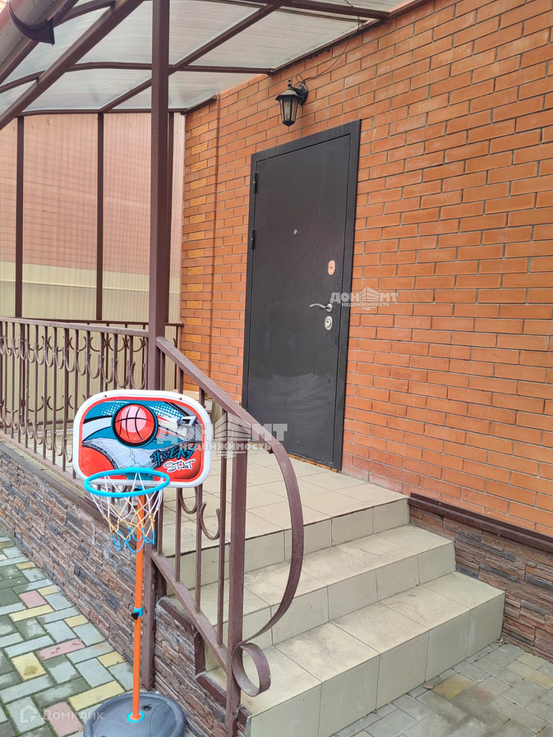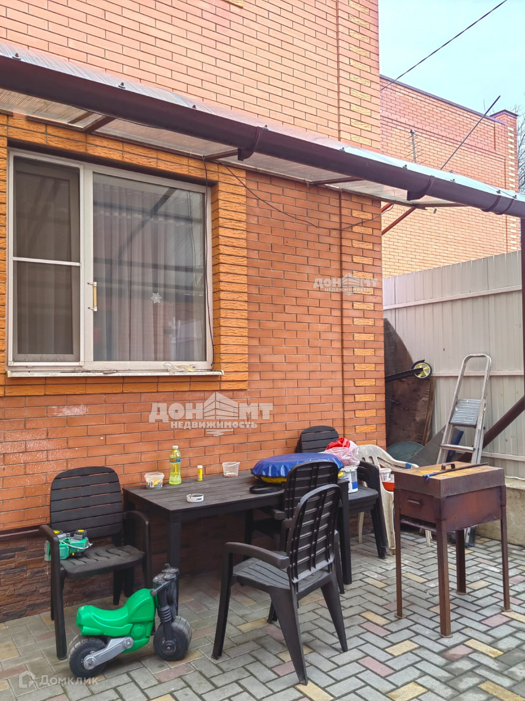 Дворовая территория выложена плиткой, над входом навес из поликарбоната, есть зона отдыха и барбекю.