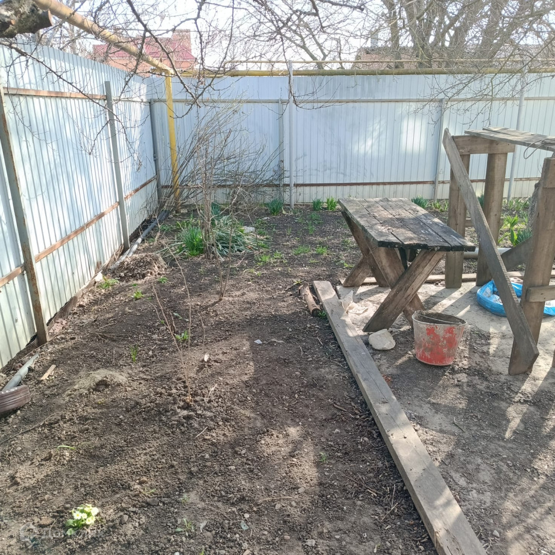 Во дворе есть место для отдыха и парковки автомобиля. Посажены фруктовые деревья, молодые кустарники малины.