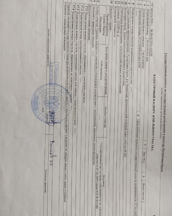 Продаю земельный участок , категория земель : земли сельскохозяйственного назначения , площадью 151589 м. кв., расположенный по адресу: Республика Крым, Ленинский район, Батальненское сельское поселение, лот 35, участок 447. Торг.