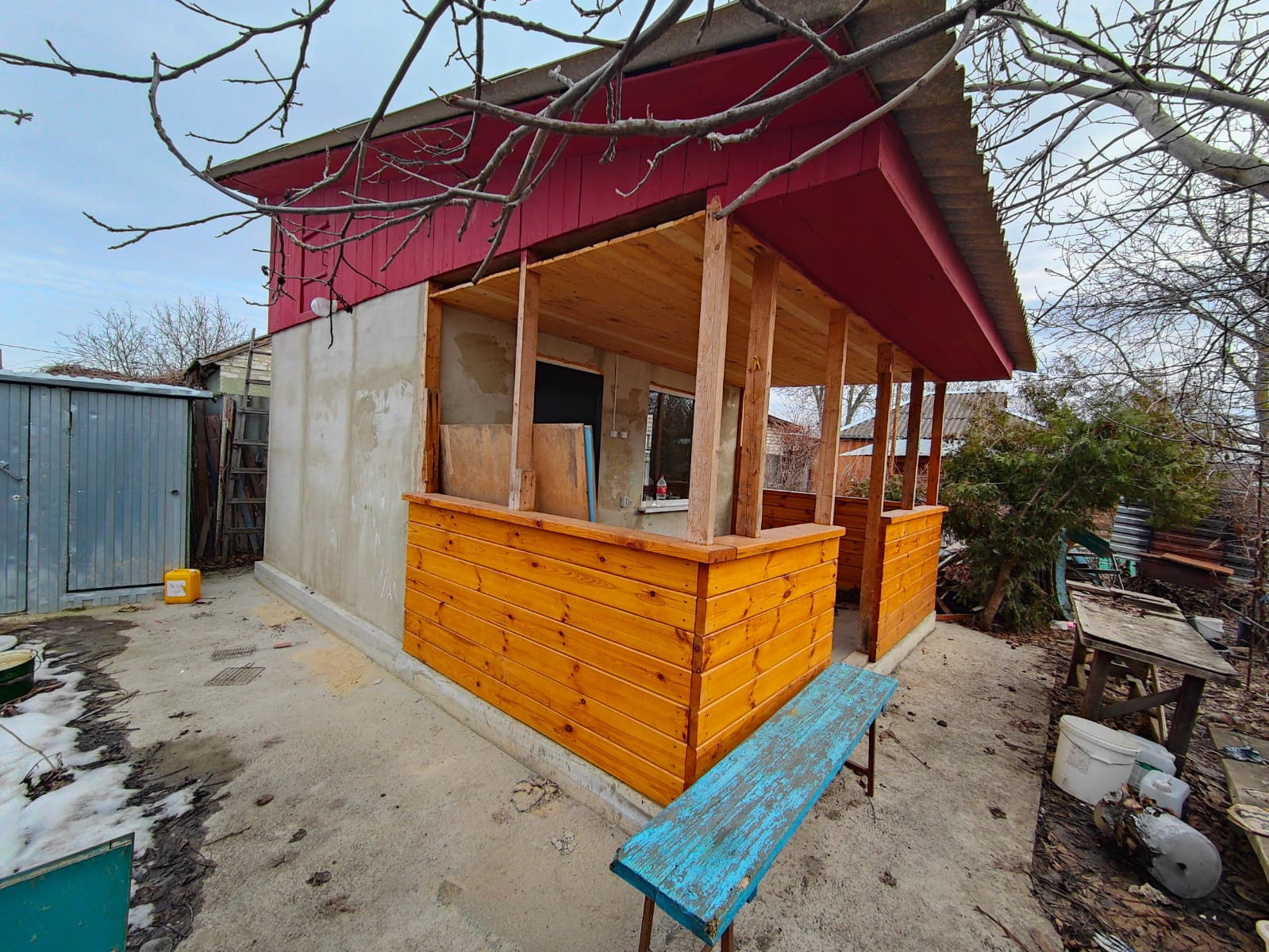 Домик 12 кв.м. плюс 12 кв.м. веранда, при желании можно расширить и сделать вместо веранды вторую комнату и продлить крышу для зоны отдыха- фундамент залит для этого, шифер утолщенный, стропильная система из толстой доски обработанной огне-биозащитой, электричество в домике и на участке разведено.