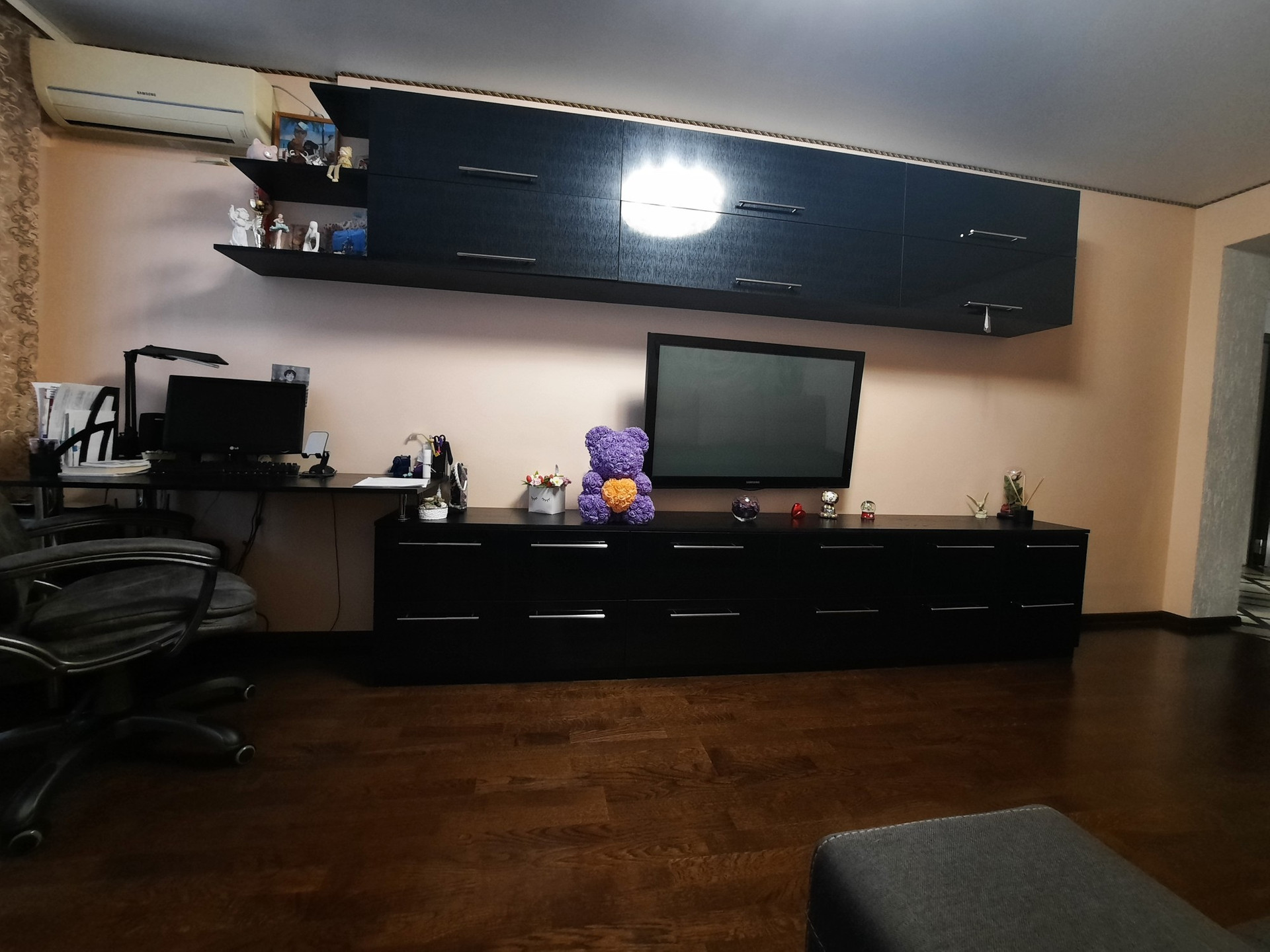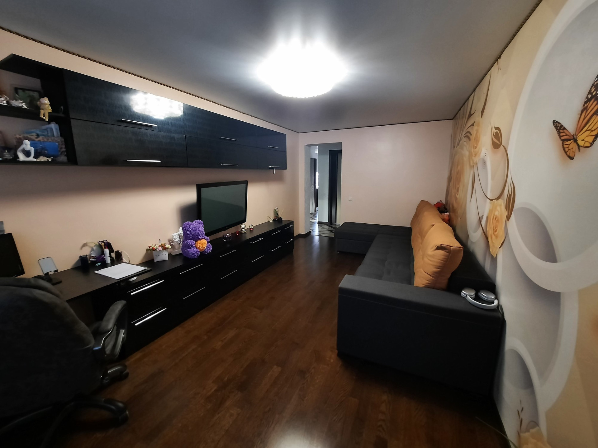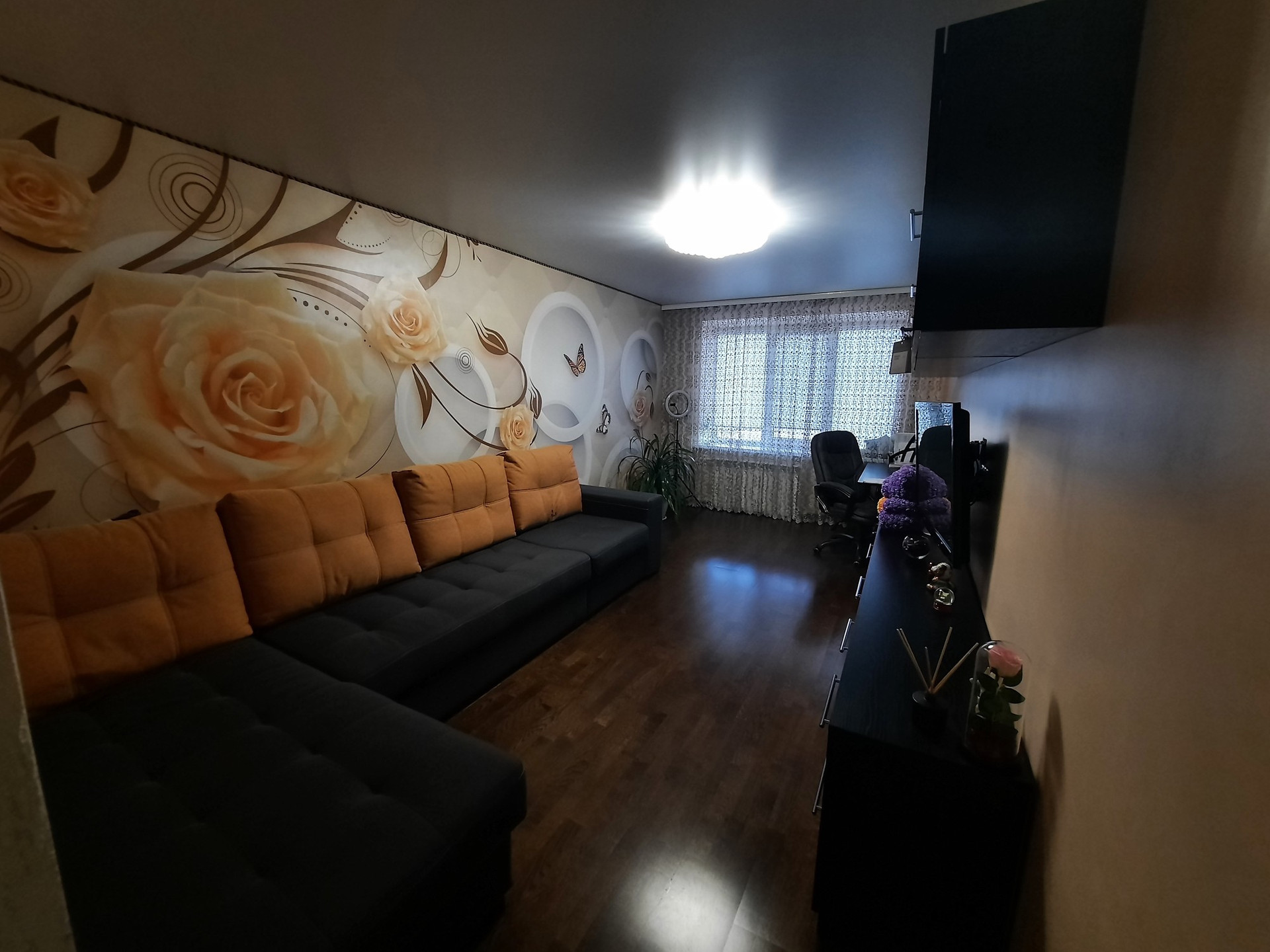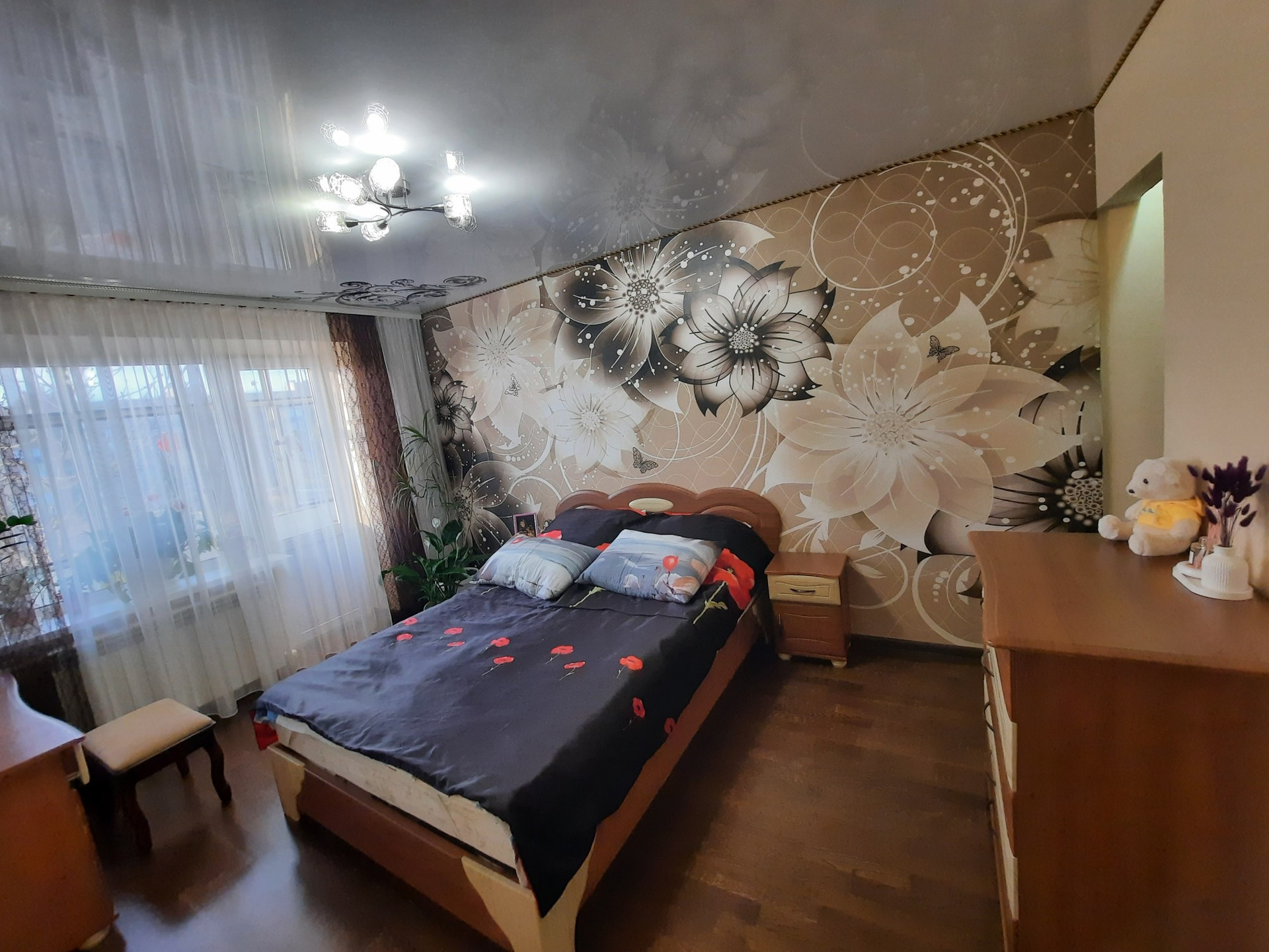 В спальне глянцевый белый натяжной потолок, в гостиной двойной натяжной  потолок днем белый матовый, ночью можно включить звездное ночное небо. Пол спальня и гостиная паркетная доска.
