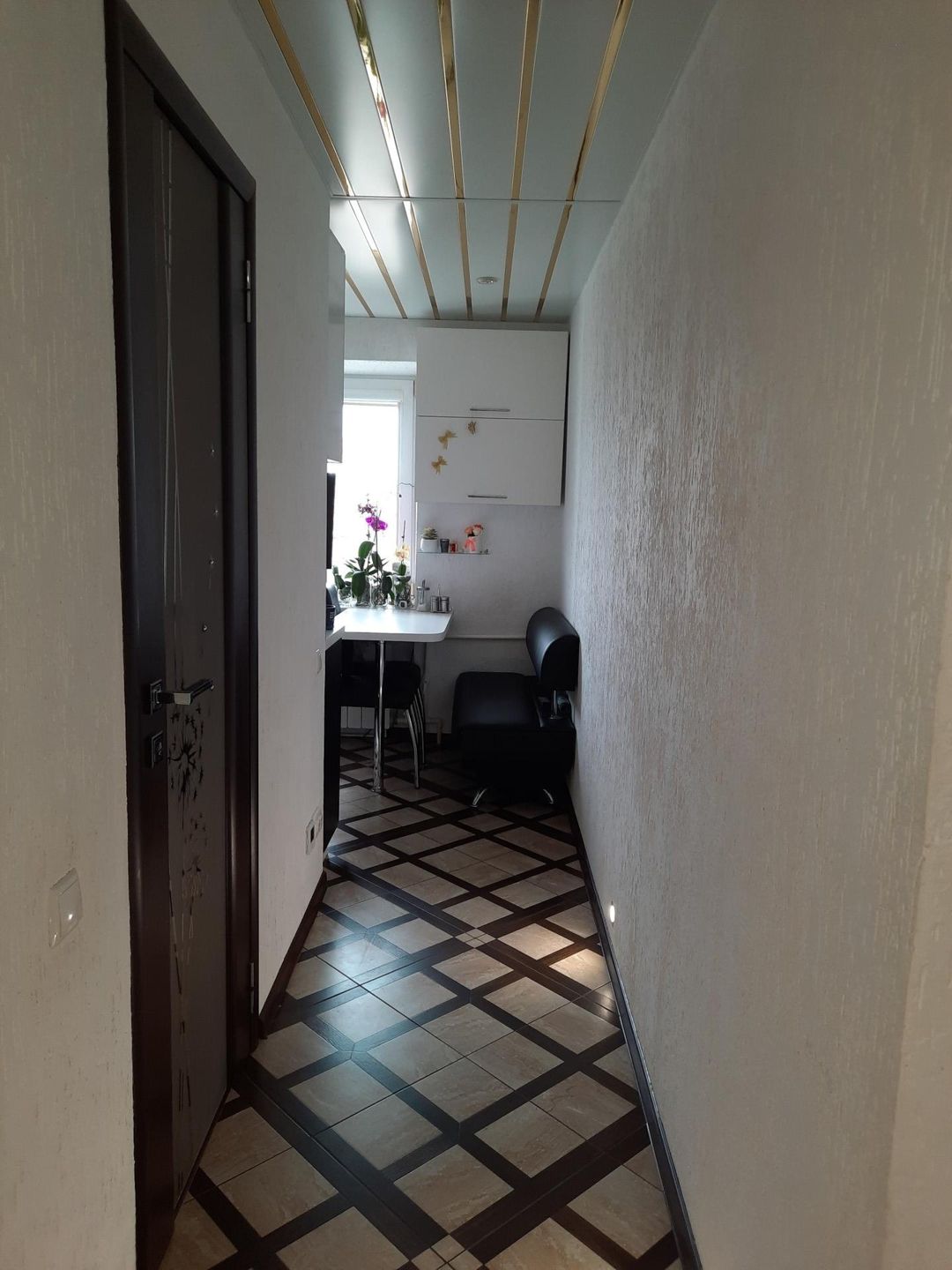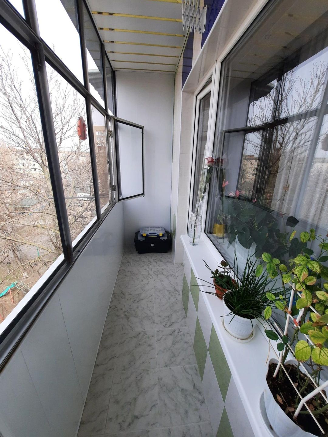 Балкон остеклен, стены в кафель/пластик, пол кафель, потолок  алюминиевый реечный.