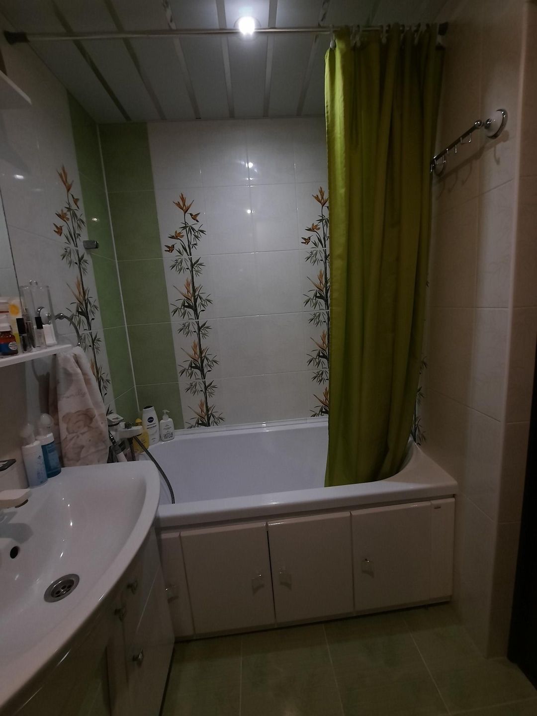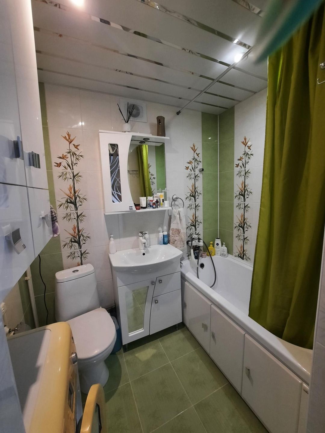 Ванная вся в кафеле, потолок реечный алюминиевый, пол с электроподогревом.