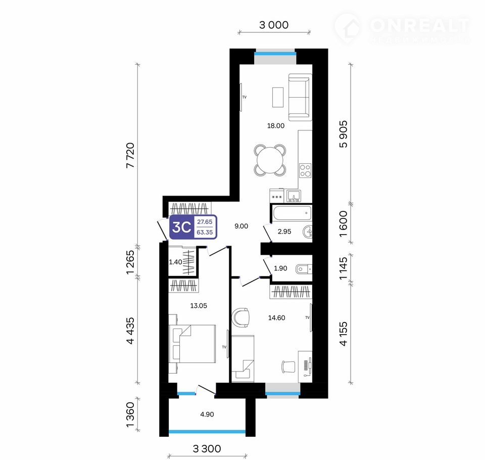 •     общая площадь квартиры — 63.35 кв.м.,