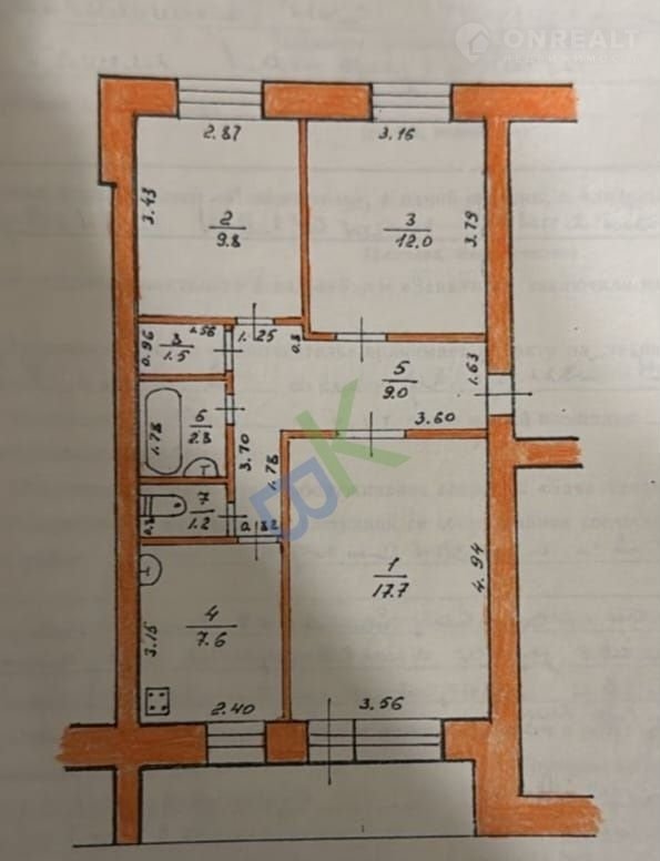 Пpoсторные ИЗОЛИPОВAHНЫЕ комнаты (17,7 кв.метров, 12,0 кв.метров и 9,8 кв.метров).