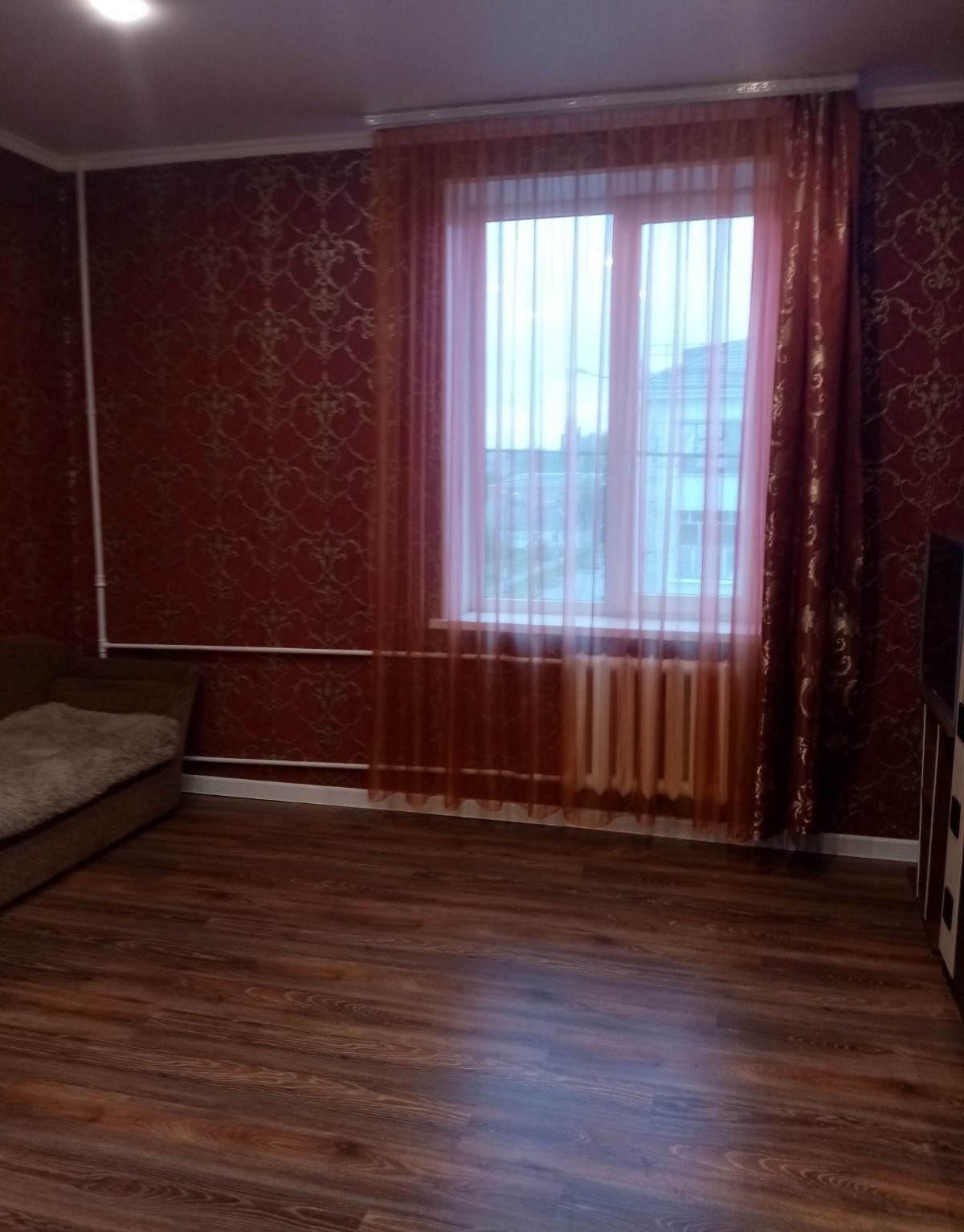 Диван, шкаф,телевизор. Натяжной патолок, пол ламинат. Душ в подвале, постирочная, туалет, кухня на этаже.