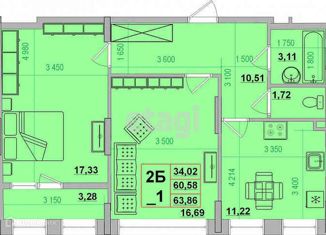 2-комнатная квартира на продажу, 60.7 м2, улица Николая Островского, 11