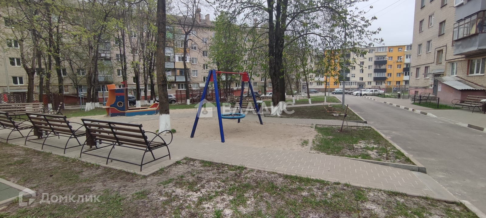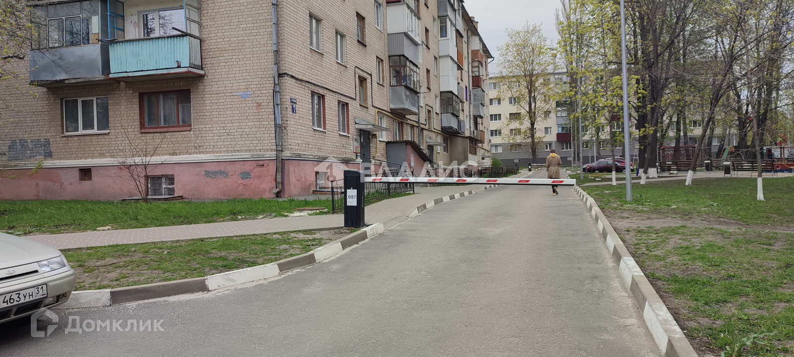 Зеленый благоустроенный двор со шлагбаумом, с современной детской площадкой.