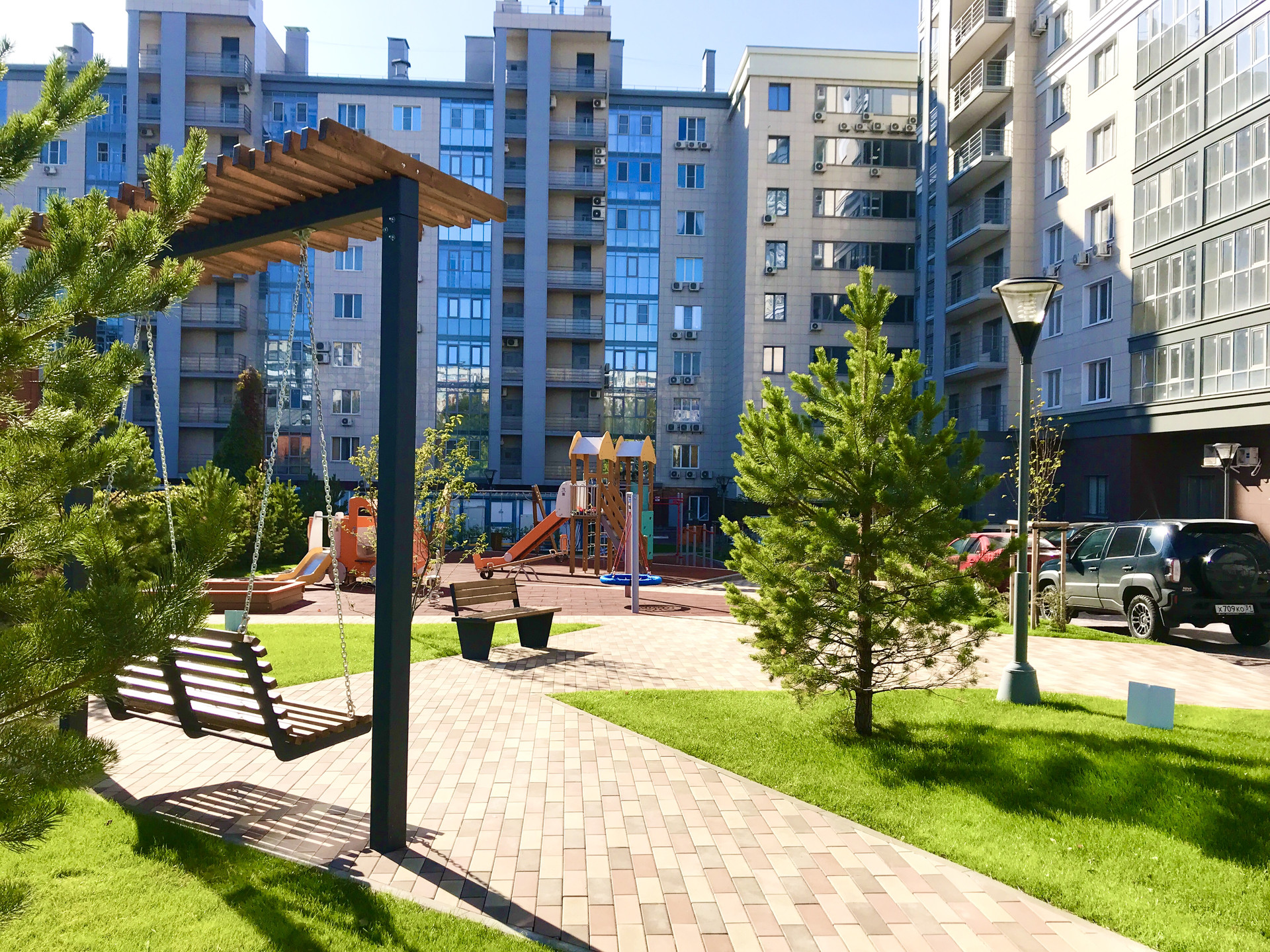 Уютный, закрытый от посторонних двор, включает в себя детскую площадку, небольшую зону для занятия спортом и фитнесом, скамейки для отдыха, элементы озеленения.