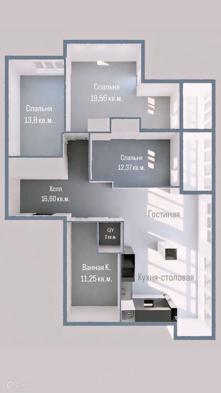 Изолированные спальные комнаты (19,6 кв.м.; 13,8 кв.м. 12,4 кв.м).