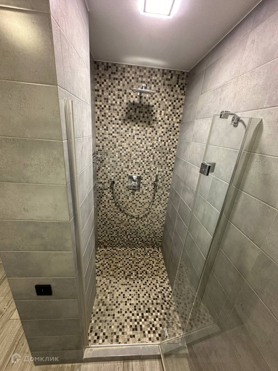 душевая кабина со стеклянной дверью, выложена мозайкой;