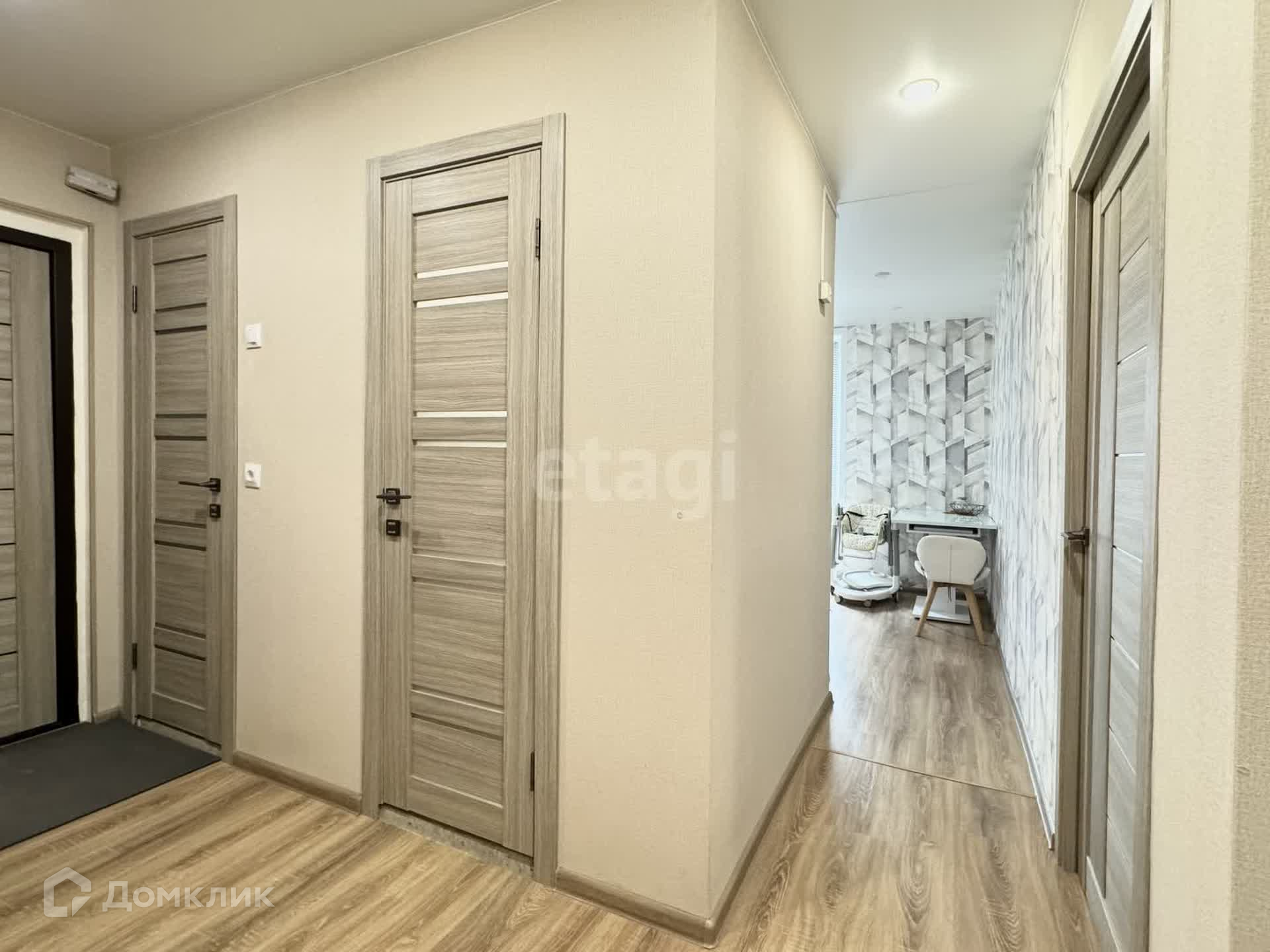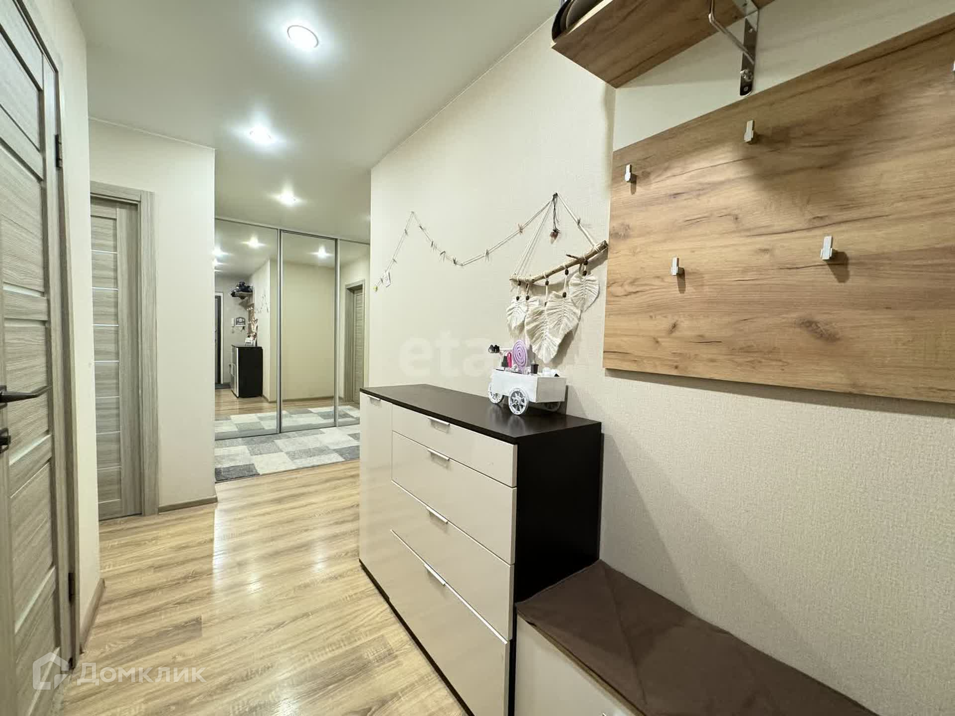 Планировка распашонка: комнаты расположены на противоположные стороны и между комнатами есть большая ниша, которую можно использовать как дополнительную комнату , на данный момент там встроен шкаф-купе.