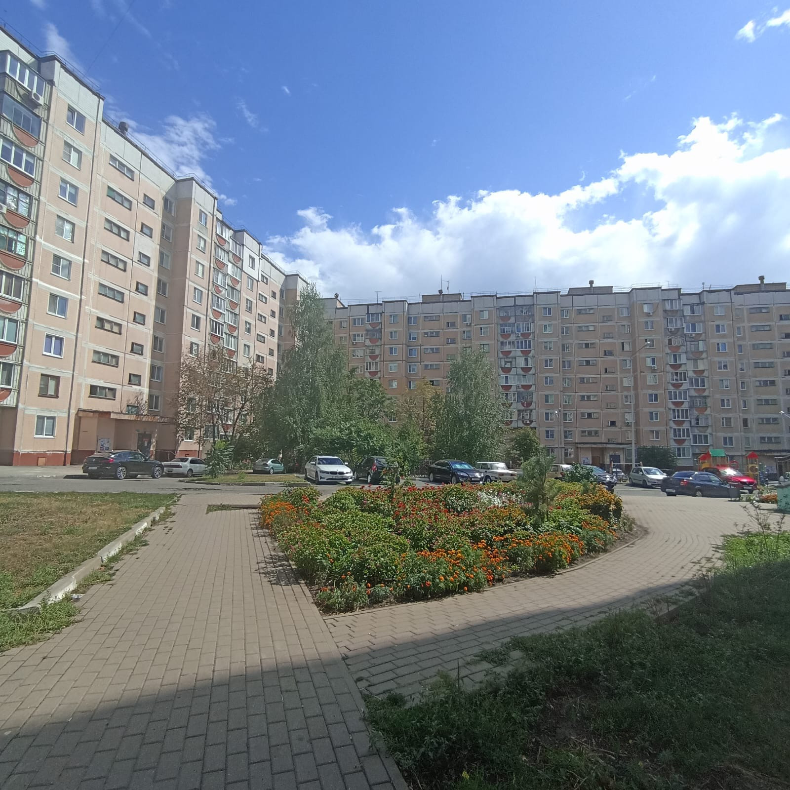 Район с развитой инфраструктурой. Благоустроенный двор с пешеходными дорожками и цветочными клумбами.