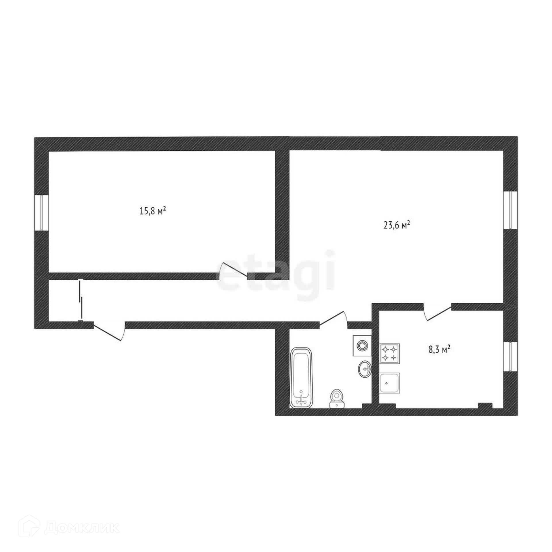 Зал-гостиная 23,6 м2. Спальня 15,8 м2. Кухня 8,3 м2, совмещённый санузел.