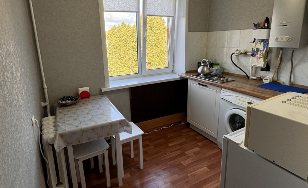 Квартира с косметическим ремонтом, пол линолеум, в комнате паркет, санузел в кафеле, заменены трубы и проводка, новая газовая колонка, окна пластик, балкон остеклен.