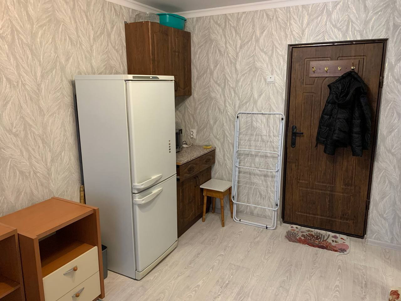 Имеется мебель: диван (раскладной), столик журнальный, пара стульев, небольшой кухонный уголок, сушка для белья, шкаф для одежды с зеркалом, 2 тумбы.