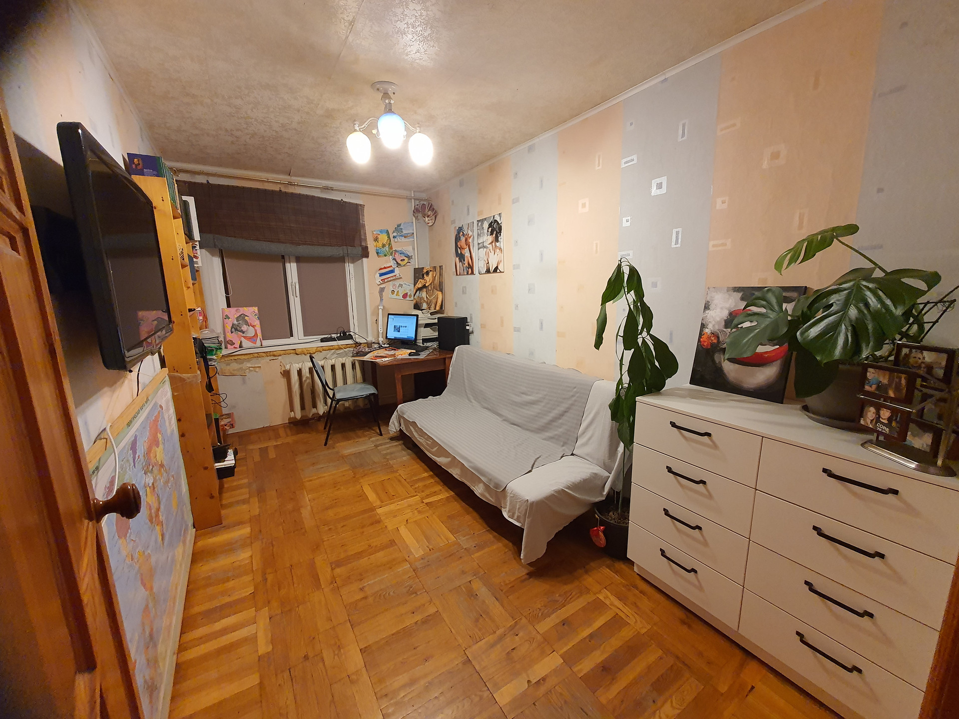 В третьей комнате раскладной диван, стеллаж, комод.