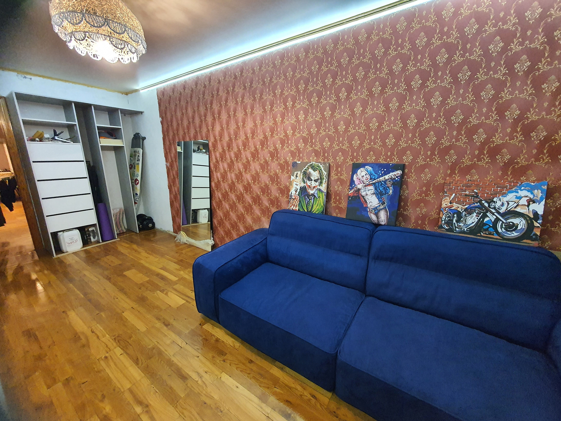 В большой спальне с лоджией есть кровать, тумбочки и шкаф-купе (открытый). Во второй комнате диван не раскладывается, но его размер позволяет спать даже взрослому человеку. Есть шкаф-купе (открытый), навесной стол компьютерный и тумбочка.