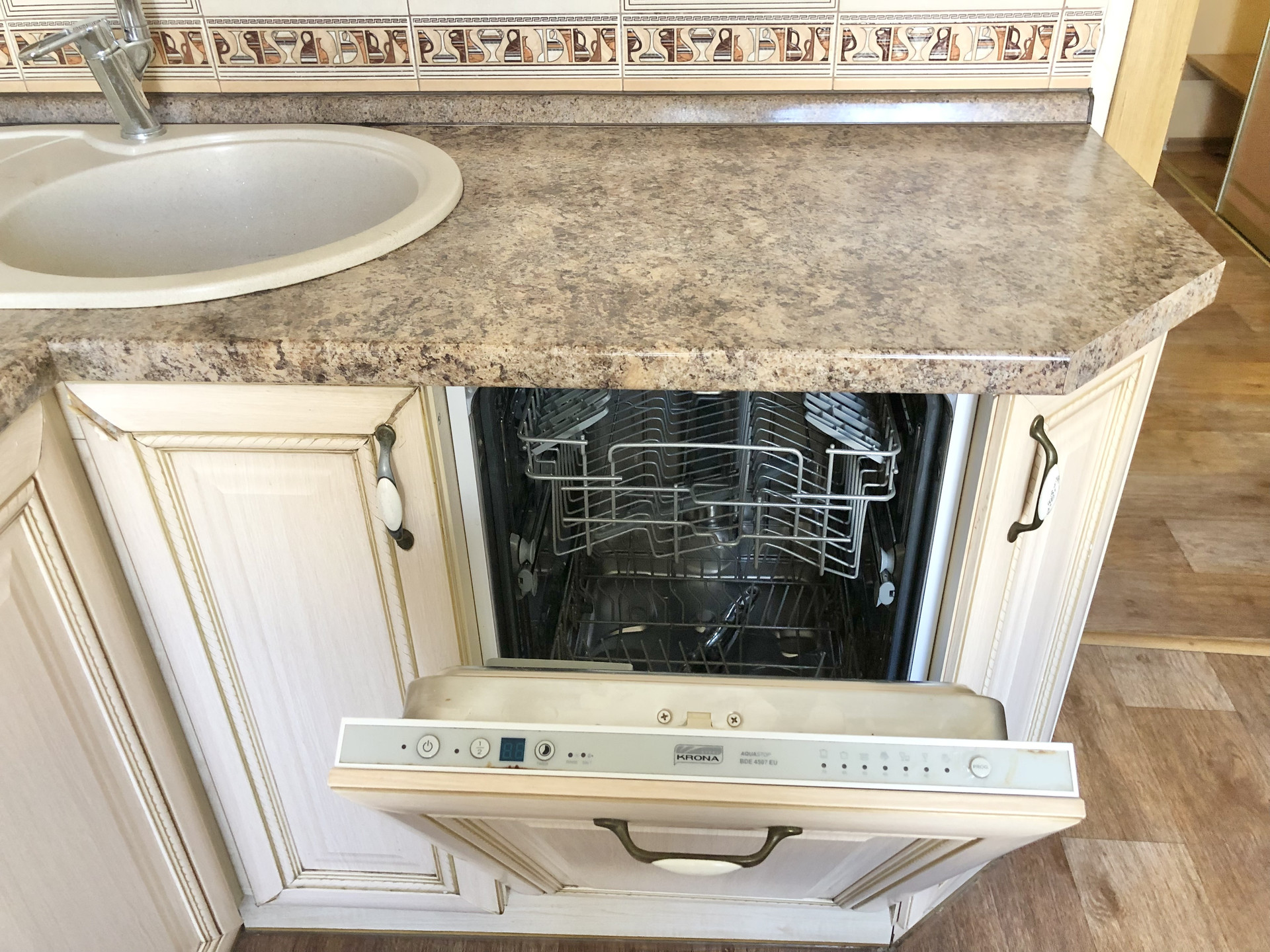 Посудомоечная машина, No-Frost холодильник, варочная поверхность, духовой шкаф, микроволновая печь, посуда и столовые приборы.