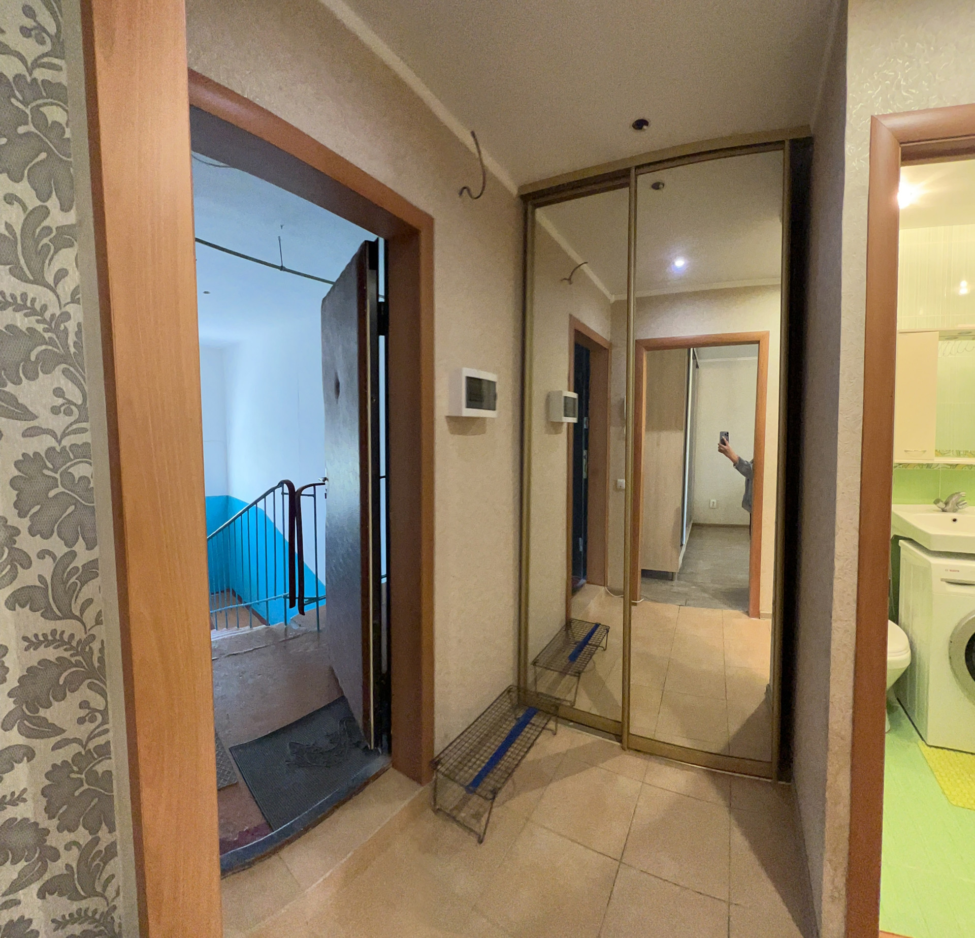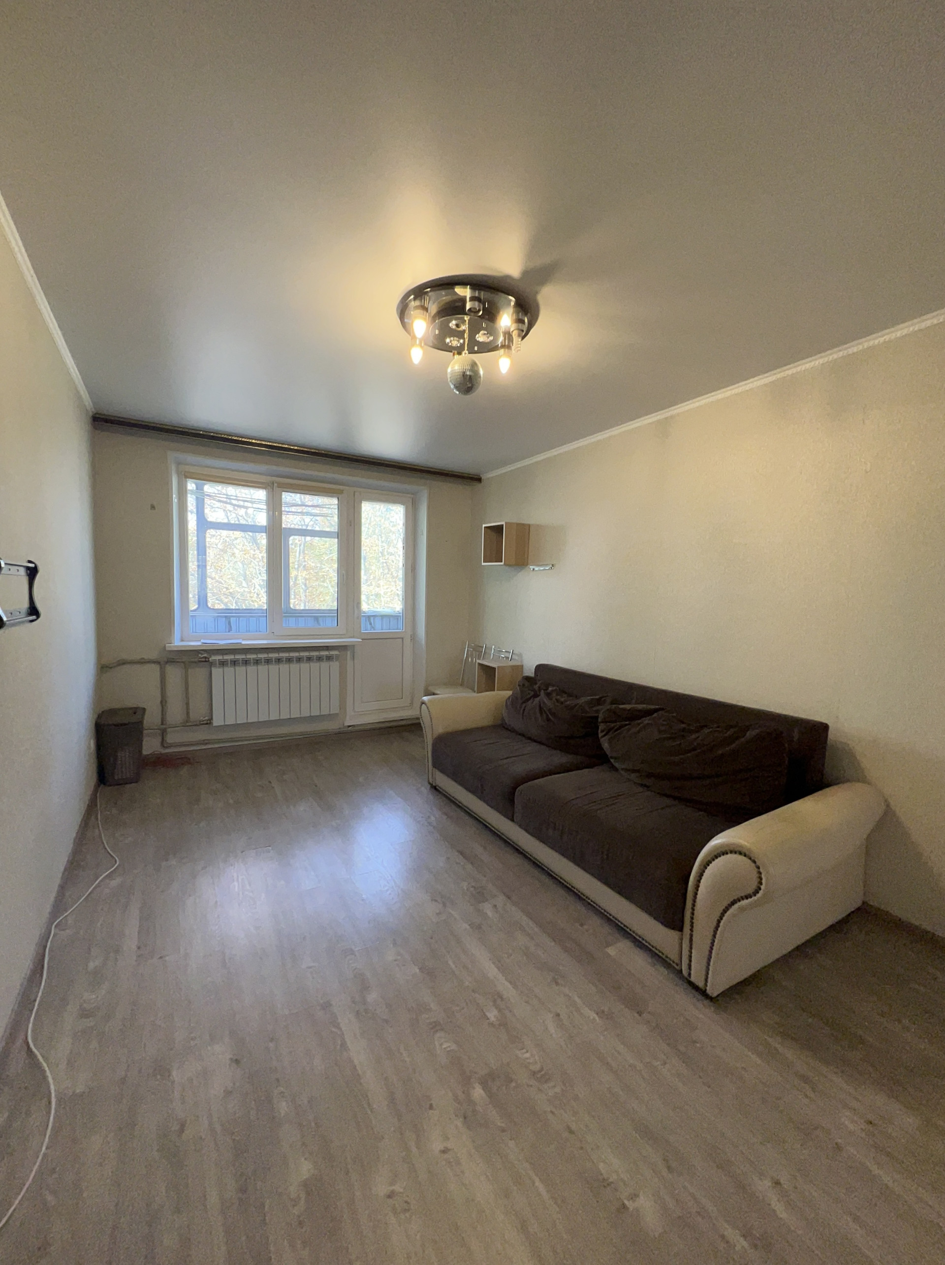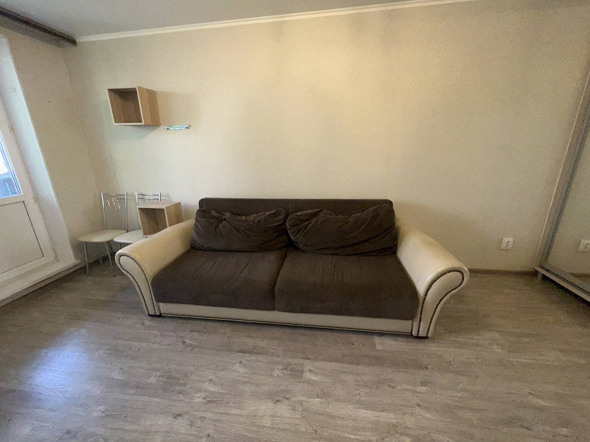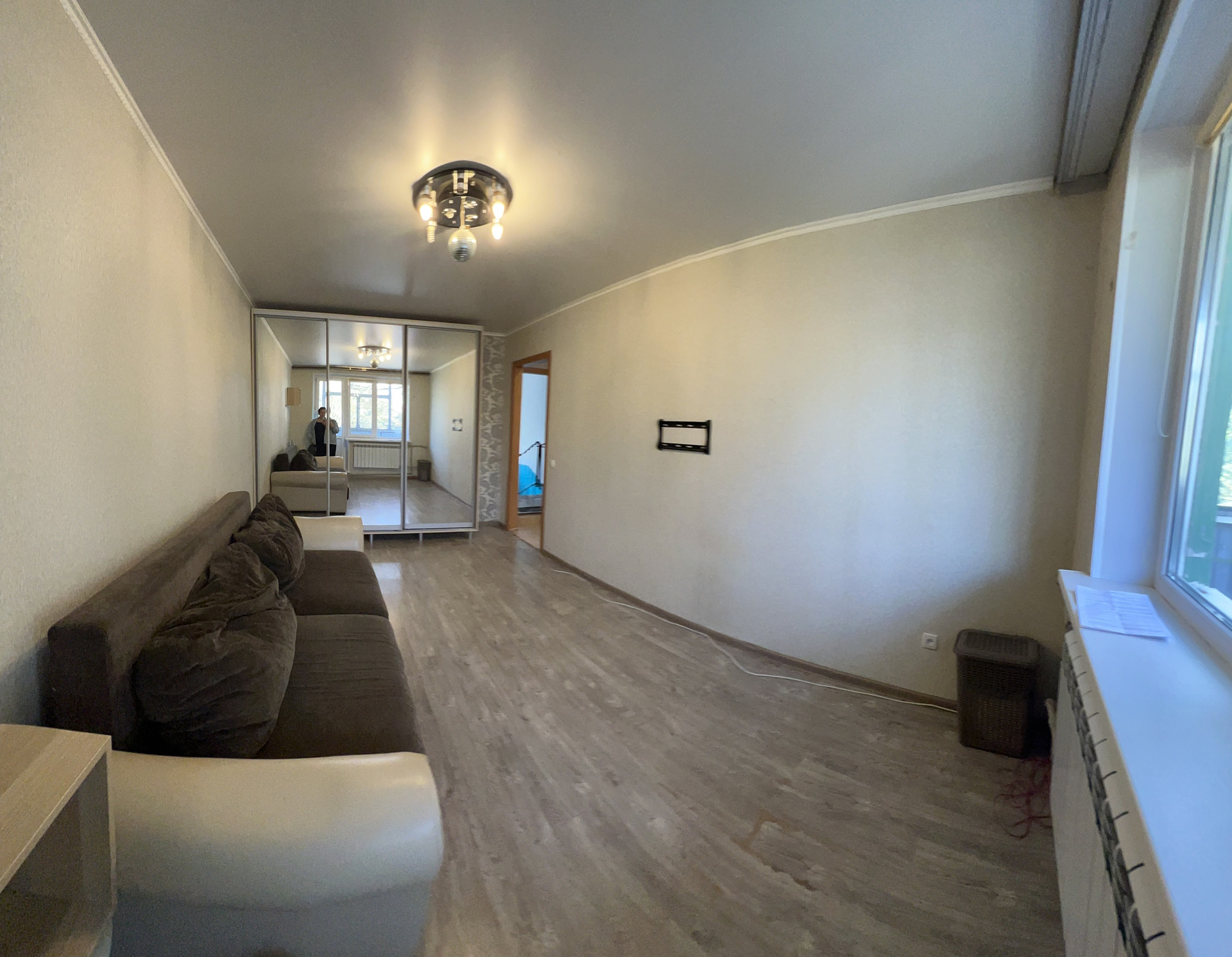 В квартире современный диван, шкаф купе, в прихожей-гардеробная.