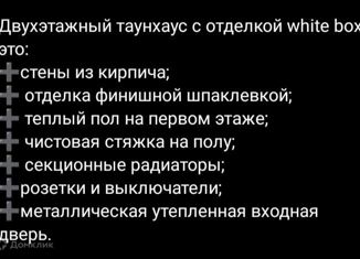 Продажа Таунхауса в мкр "Дубровка" 3 км от Сити-Мола, приватный район. Таунхаус 94 м² в микрорайоне Дубровка Чистовая отделка с высокими потолками (3 метра) оштукатурены и ошпаклеваны, на полу финишная стяжка, все коммуникации заведены, лестница, окна ПВХ, индивидуальное отопление, два этажа: Первый этаж: тамбур 2,5 м², топочная 5 м², санузел 3,2 м²... |