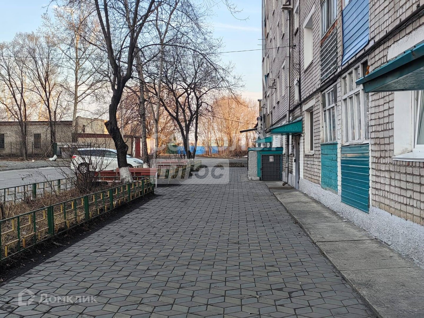 Двор весь уложен тротуарной плиткой.