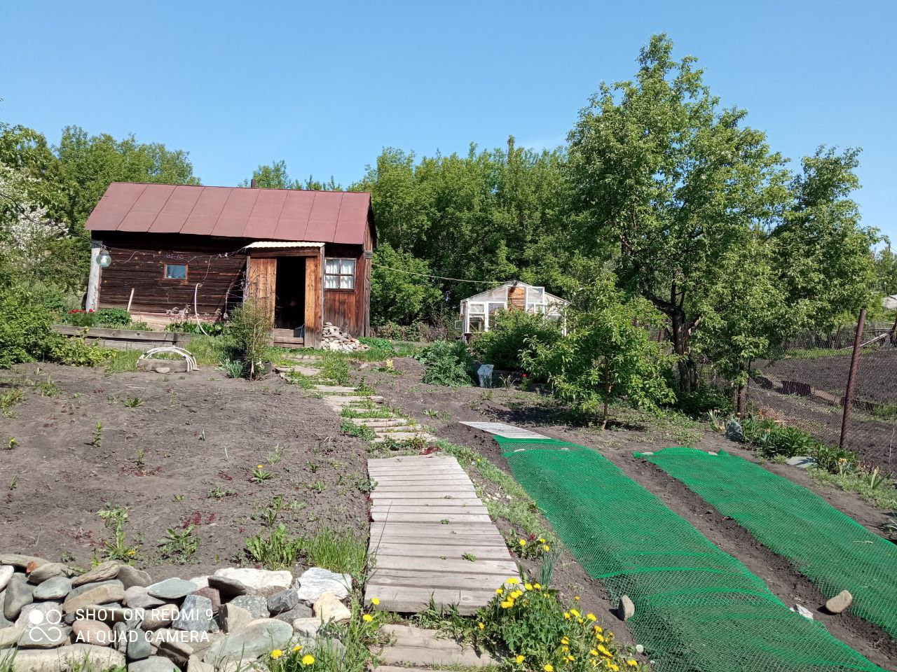 На участке растут крыжовник, жимолость, яблони, малина, вишня, стоит стеклянная теплица.