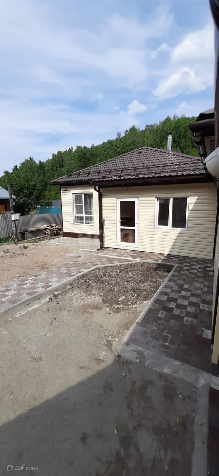 Двор, отмостка выложена тротуарная плитка . Внизу участка, у подножия леса, бежит горный ручей Татарский. Красота неимоверная!