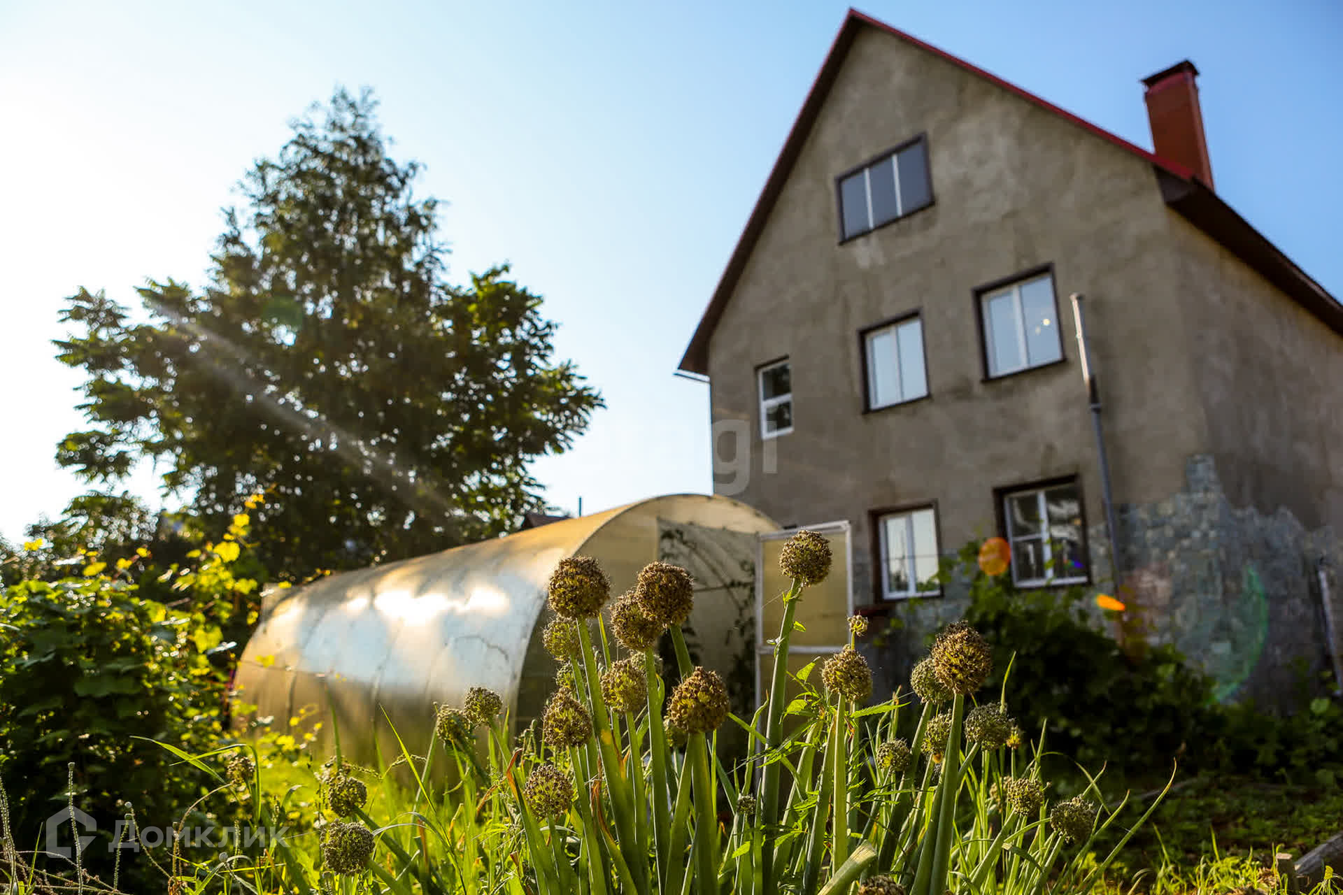 На территории есть гараж с баней и постройками. Теплица.