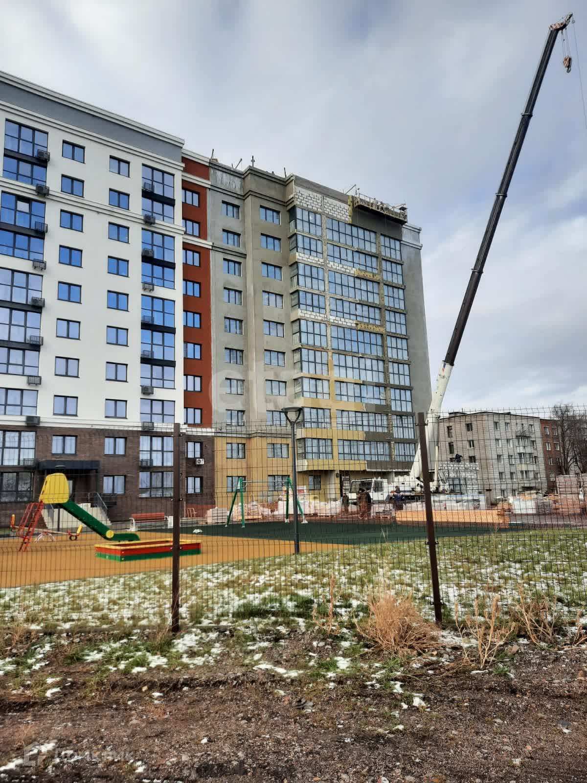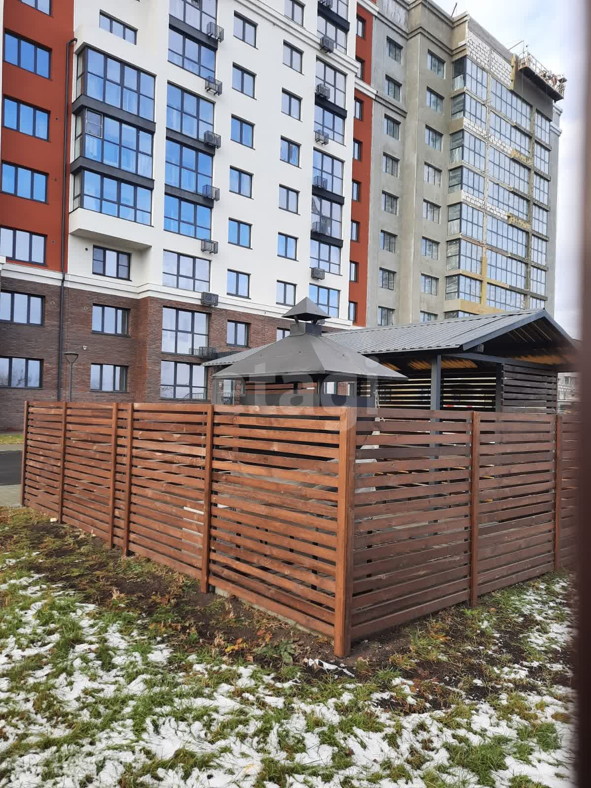 Придомовая территория огорожена и имеет современную детскую площадку с уличными тренажорами. Есть парковочные места.