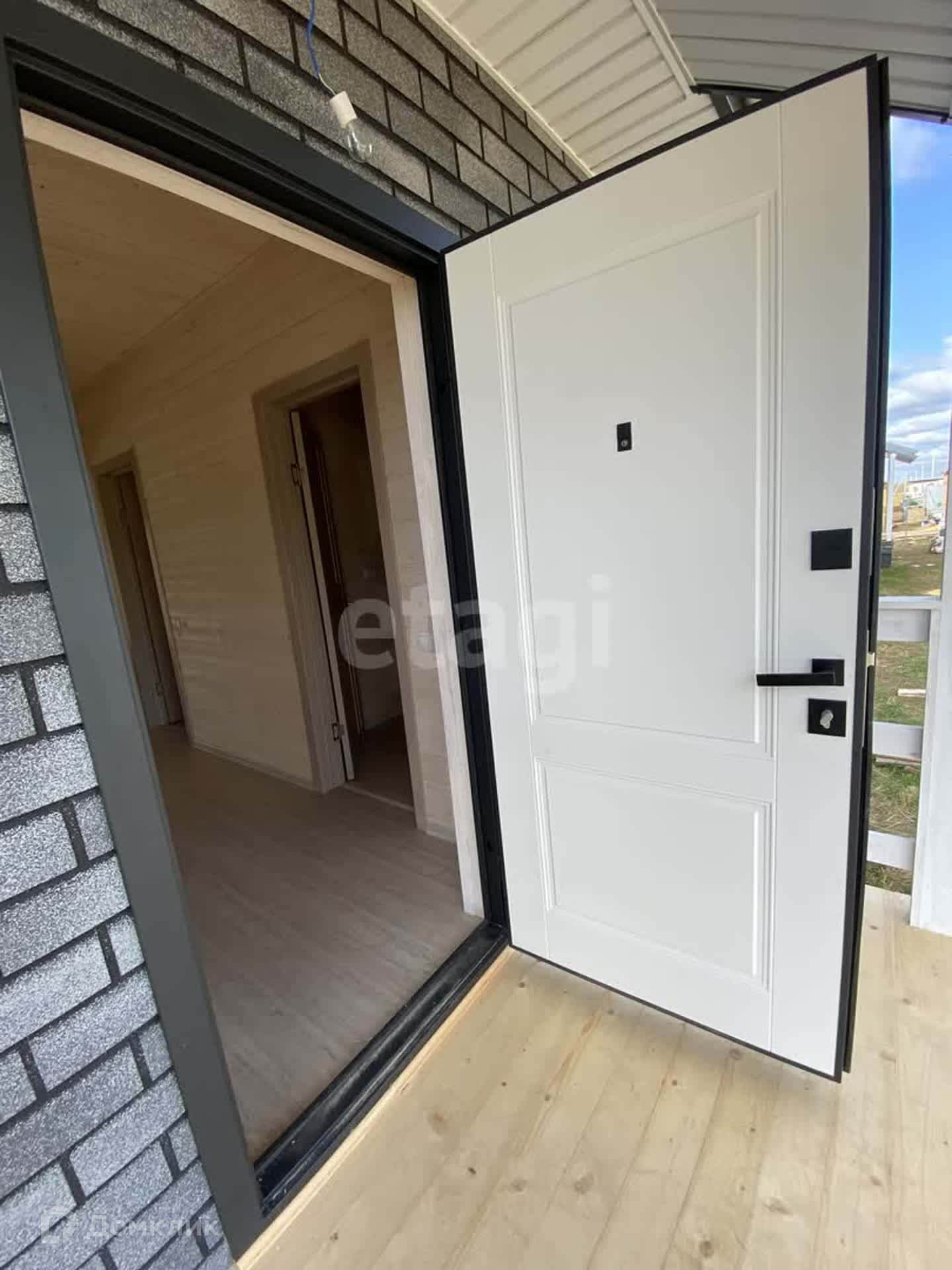 При входе в дом открытое крыльцо, расположена современная и теплая входная дверь.