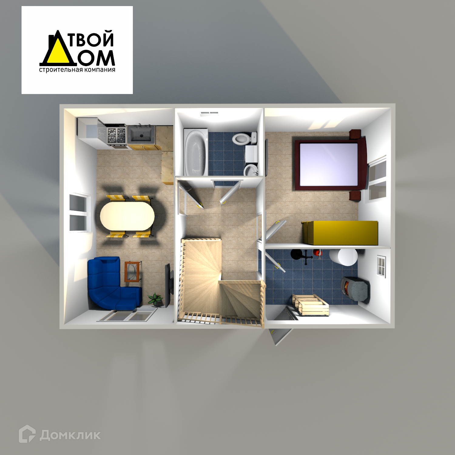 - 1-й этаж: прихожая , холл , кухня-гостиная , комната , санузел (душевая, раковина, унитаз), выводы стиральную машину
