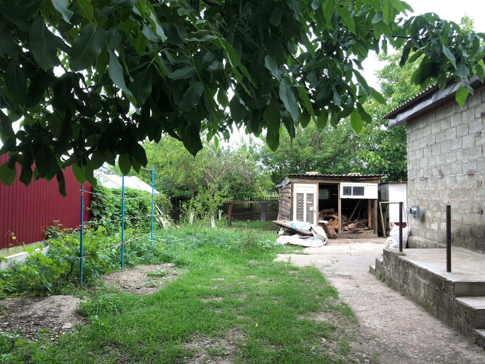 На участке посажено много плодовых деревьев,есть хоз. постройки.
