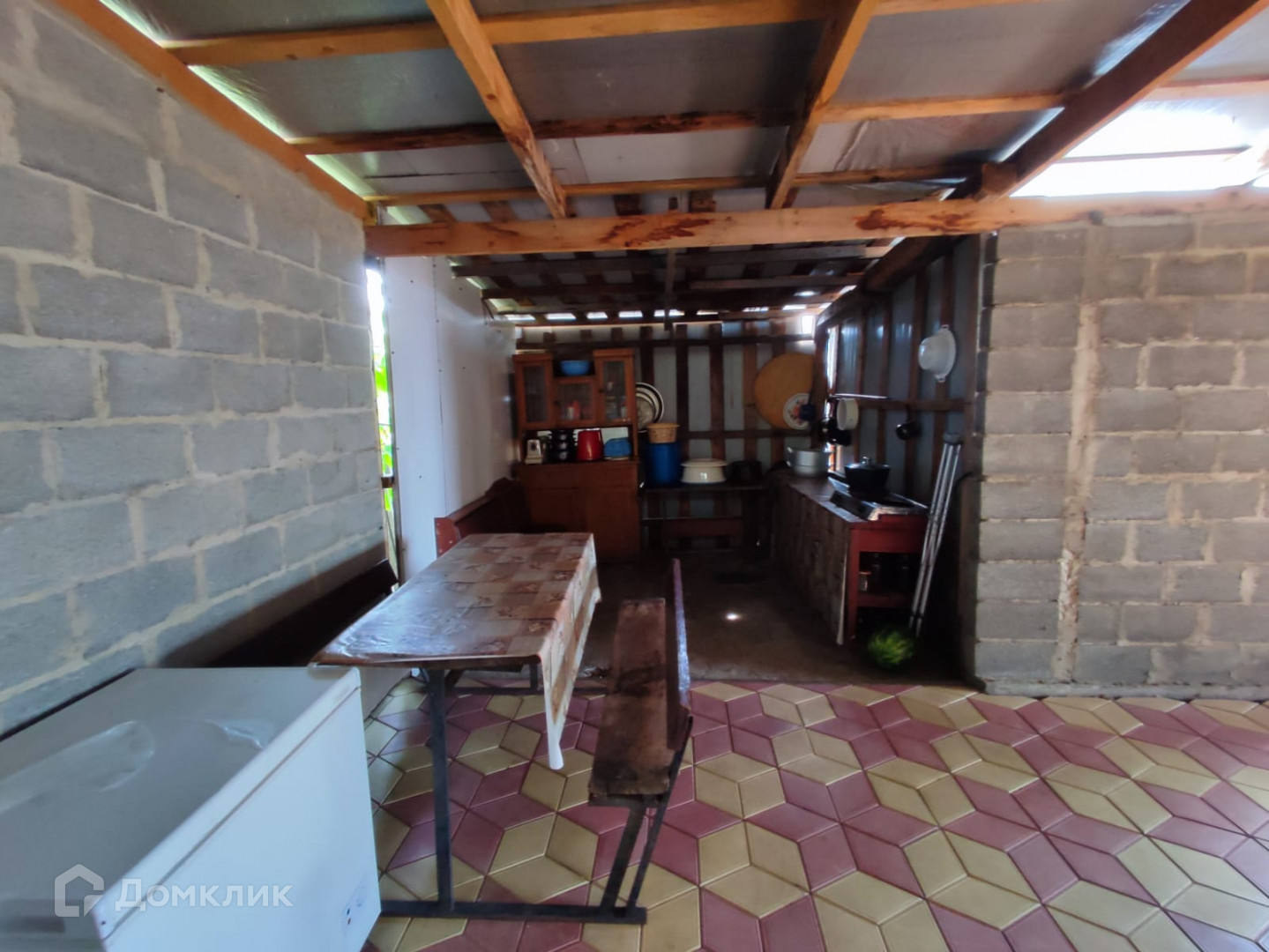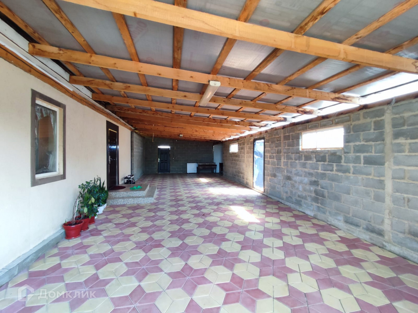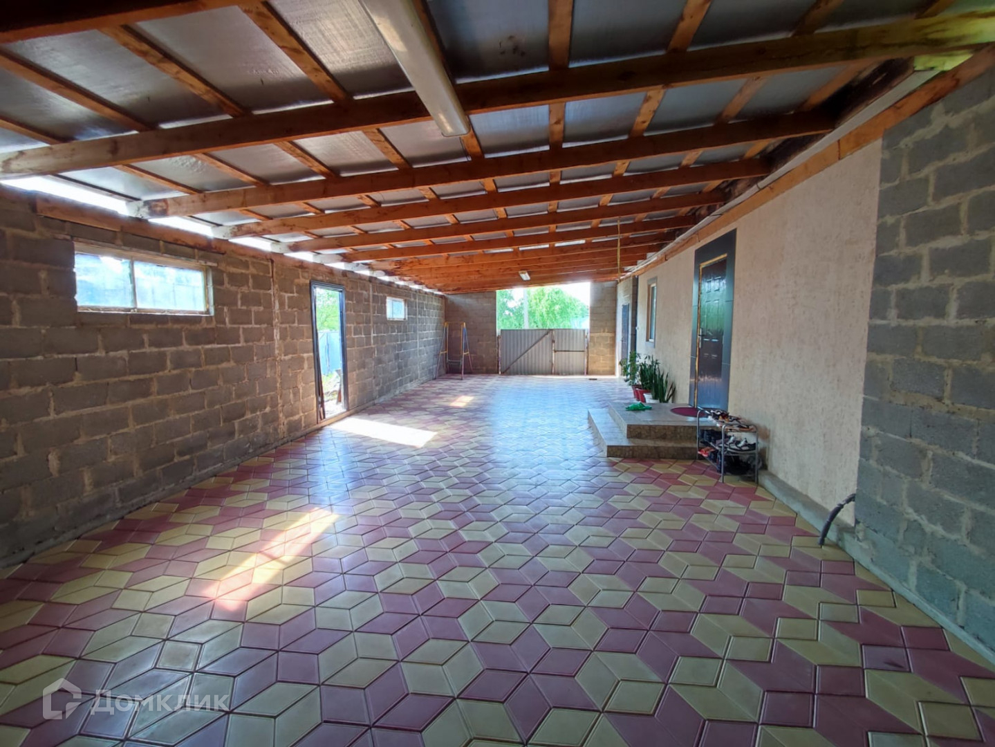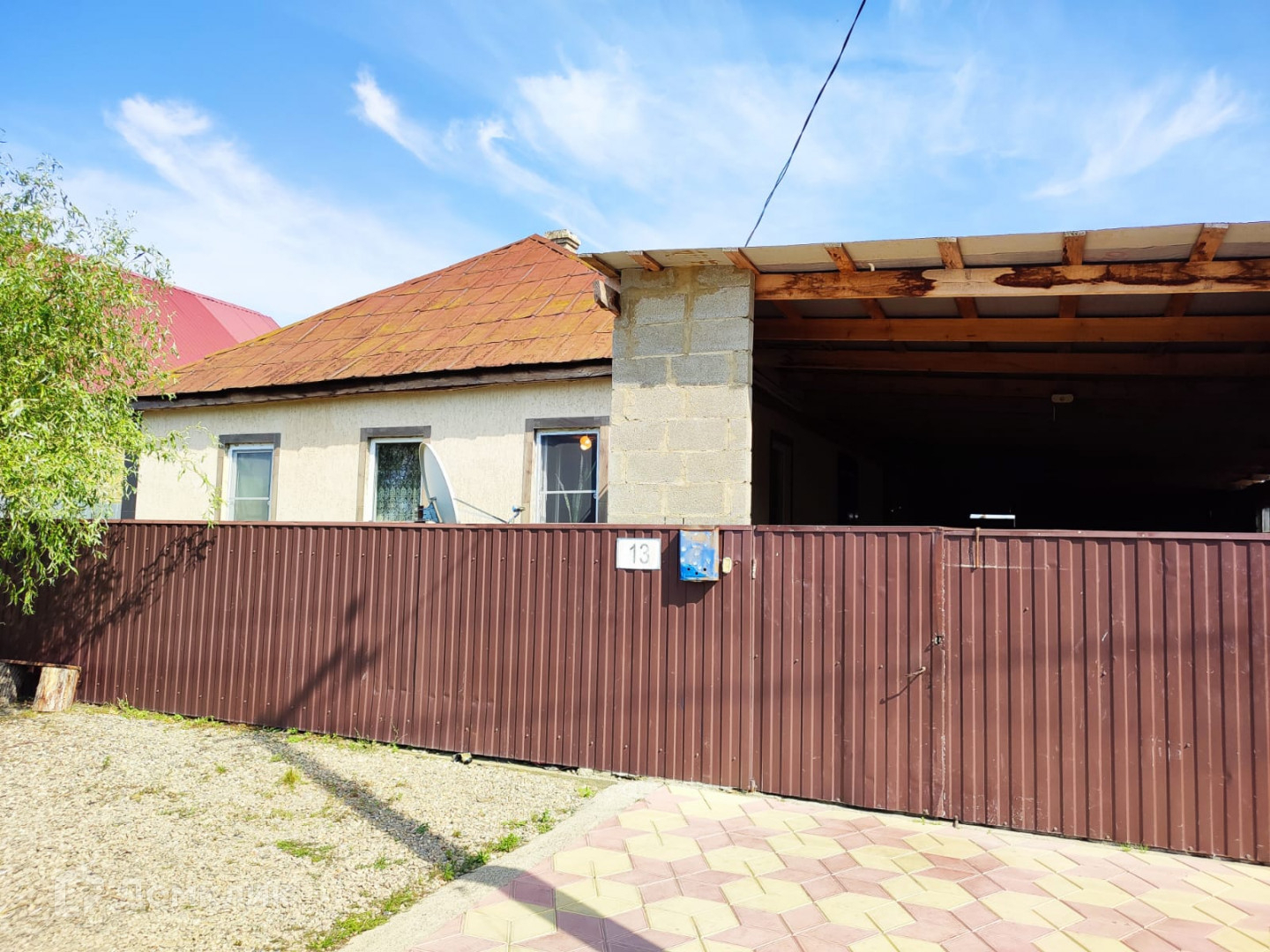 Имеется большой крытый навес, двор вымощен плиткой.