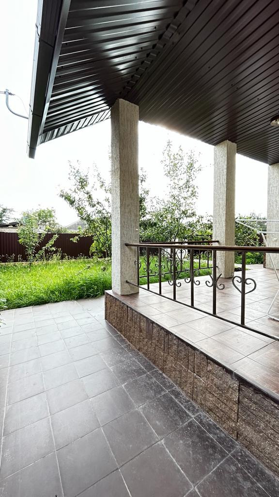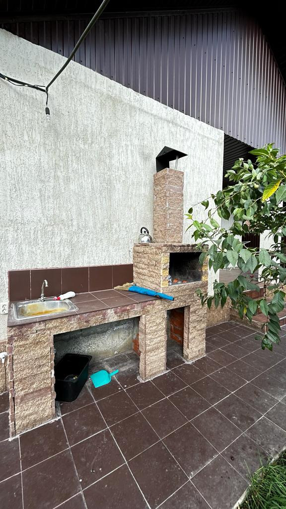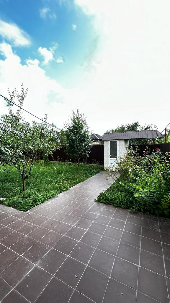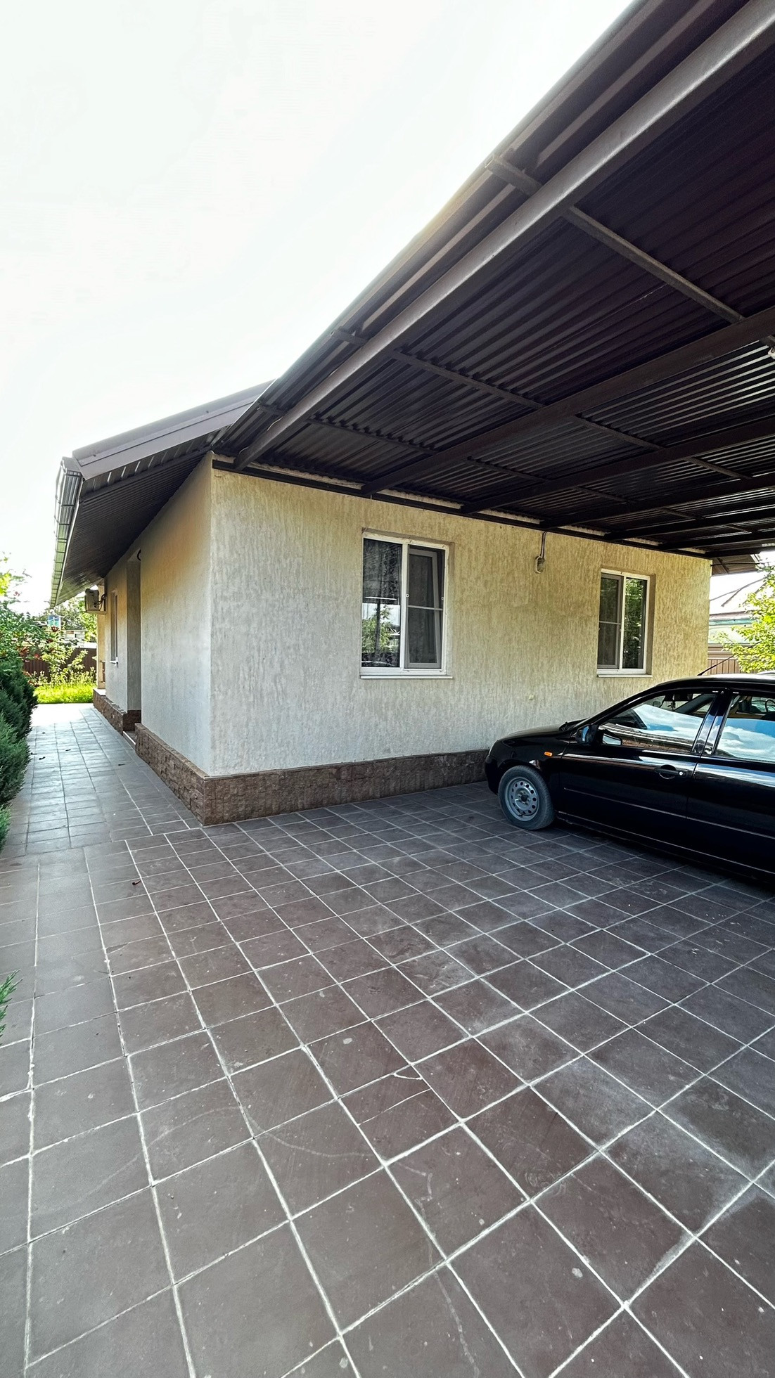 - Двор вымощен плиткой, ворота откатные, забор металлический, навес, мангальная зона