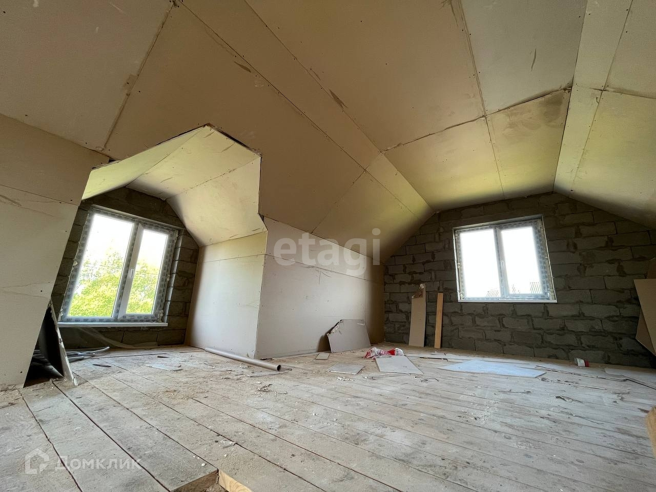 На первом этаже в доме расположены: Просторная кухня - гостинная (в ней же лестница на второй этаж) и с выходом на террасу, две изолированные светлые спальные комнаты и совмещенный санузел. На мансарде будет две спальных комнаты и санузел!
