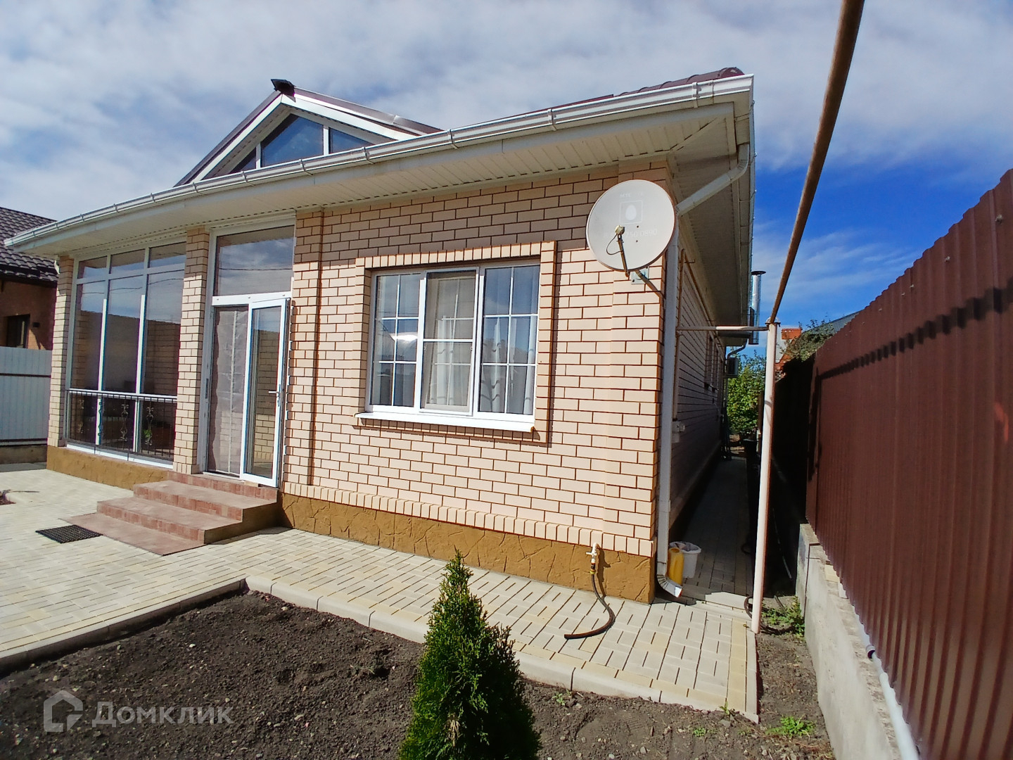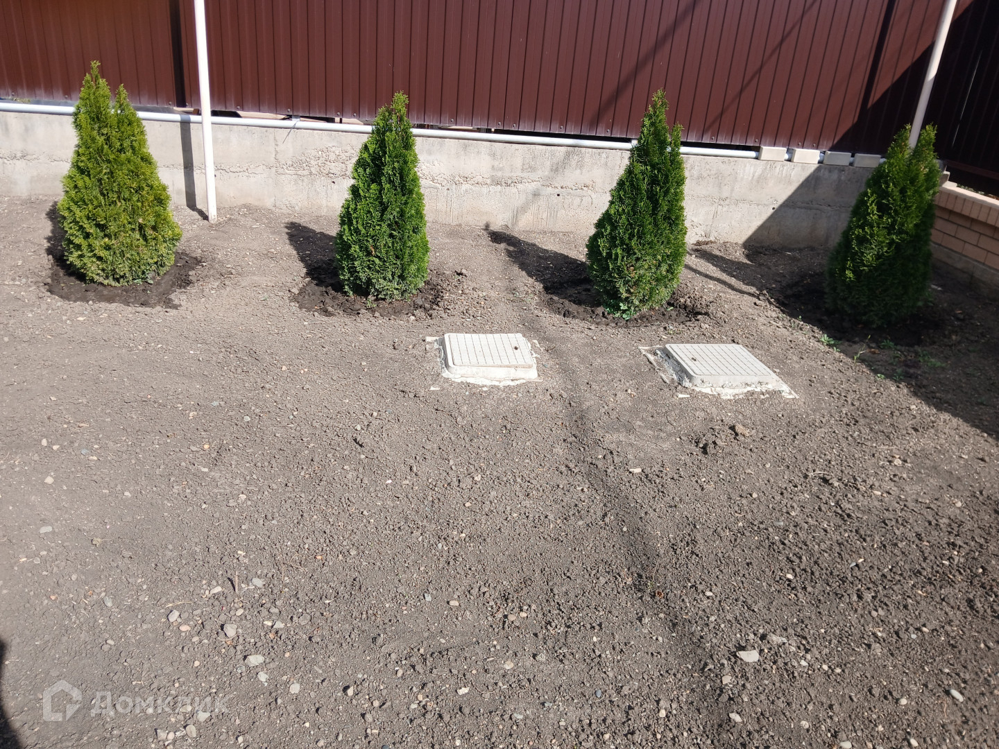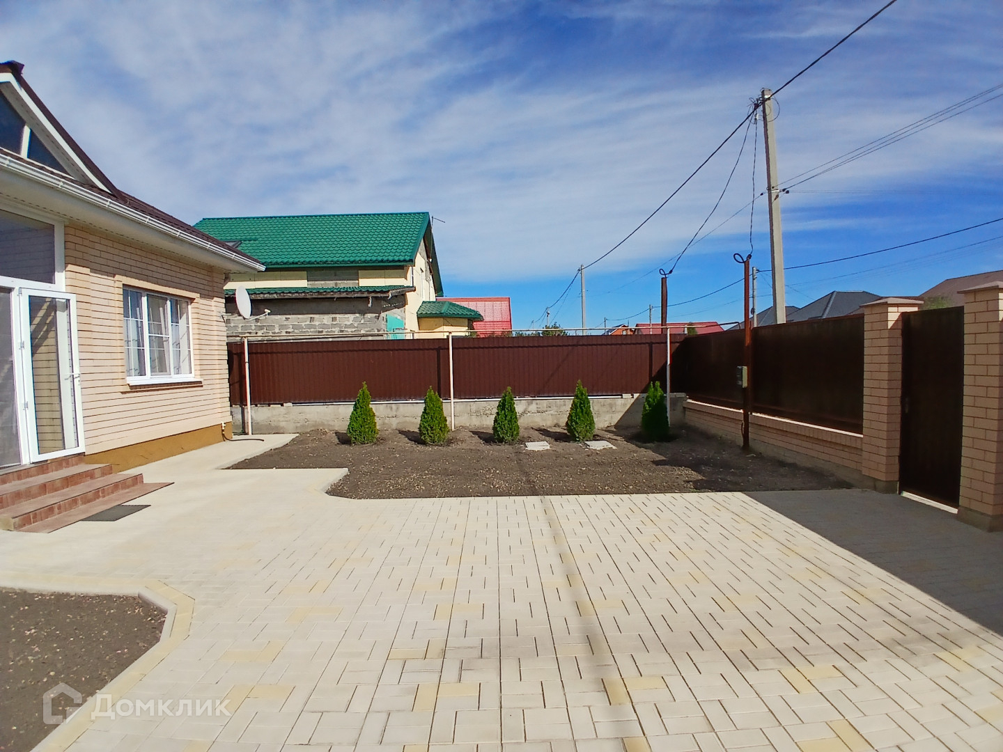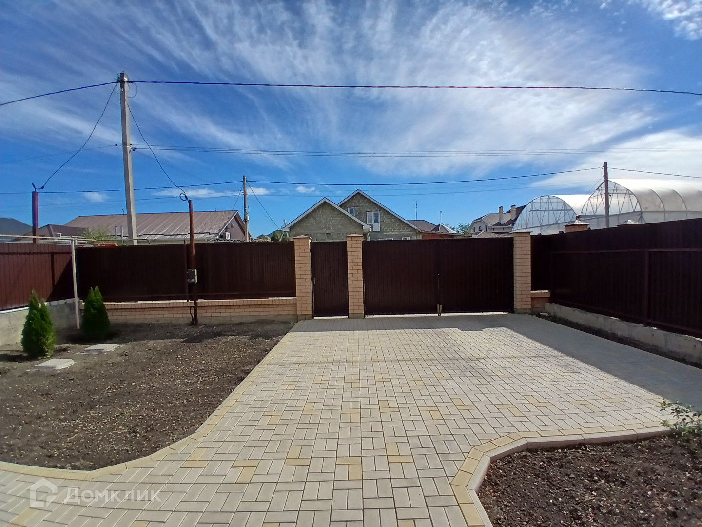 . Двор: распашные ворота, плитка, посажены туи, цветник.