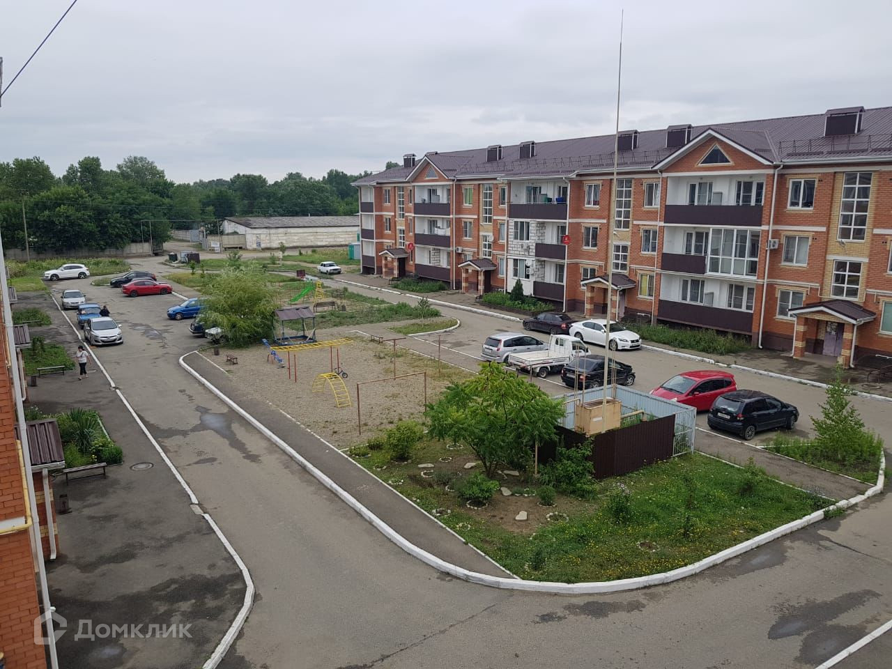 Во дворе благоустроенная детская площадка и парковочные места.