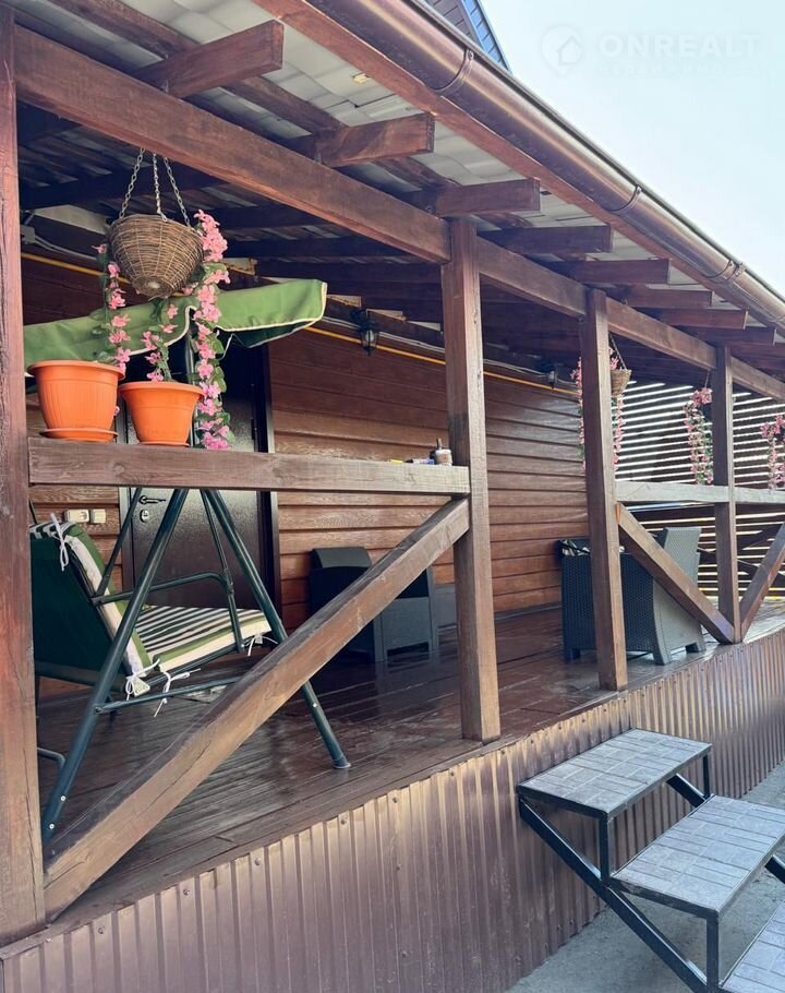 Имеется хороших размеров терраса где прекрасно размещается уличная мебель и качели.