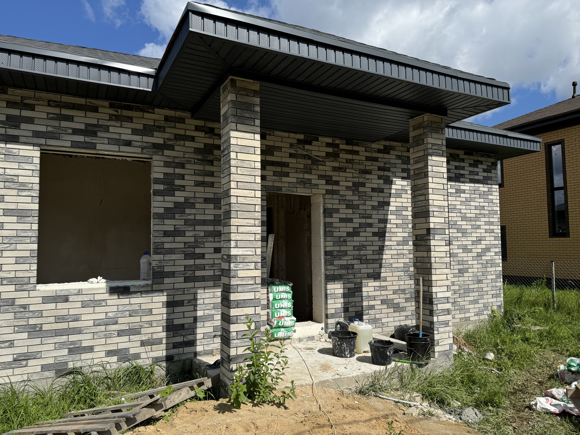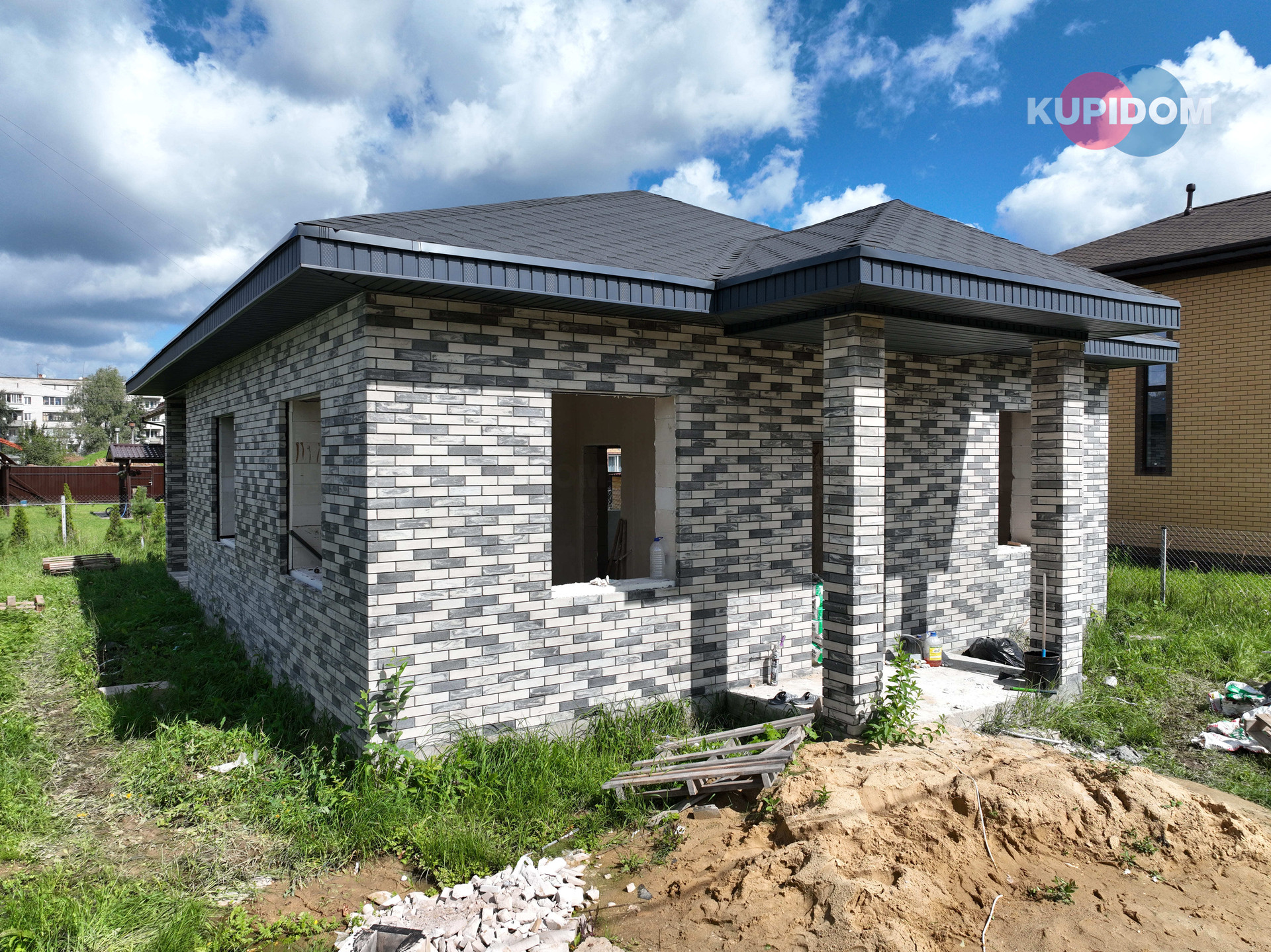 Материал дома  газоблок, включая внутренние перегородки; Внешняя отделка - облицовочный кирпич; Фундамент - монолитная армированная плита; Окна ПВХ, двухкамерные стеклопакеты фирмы REHAU; Крыша - мягкая кровля; Внутренняя отделка: стены обои и плитка в санузлах, потолок - натяжной, пол - керамогранит/ламинат; межкомнатные двери; в санузле установлена сантехника; Отделка будет выполнена в светлых нейтральных оттенках; На этапе отделки можно вносить корректировки в соответствии с вашими предпочтениями.