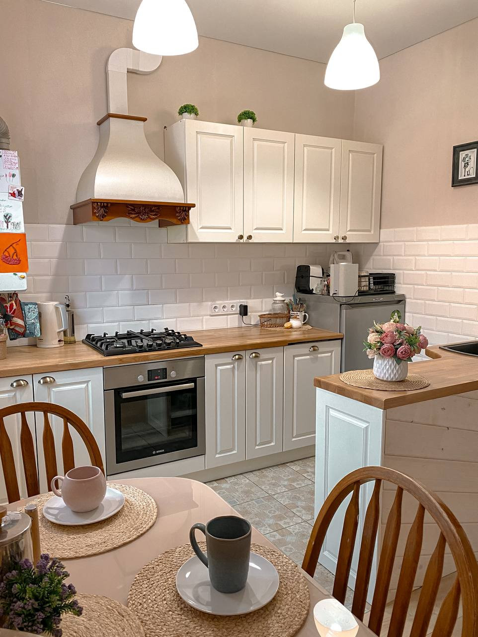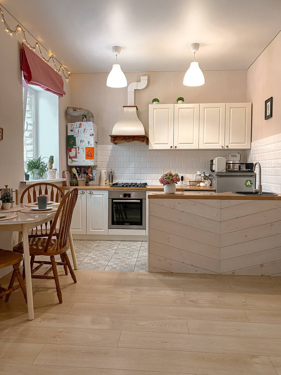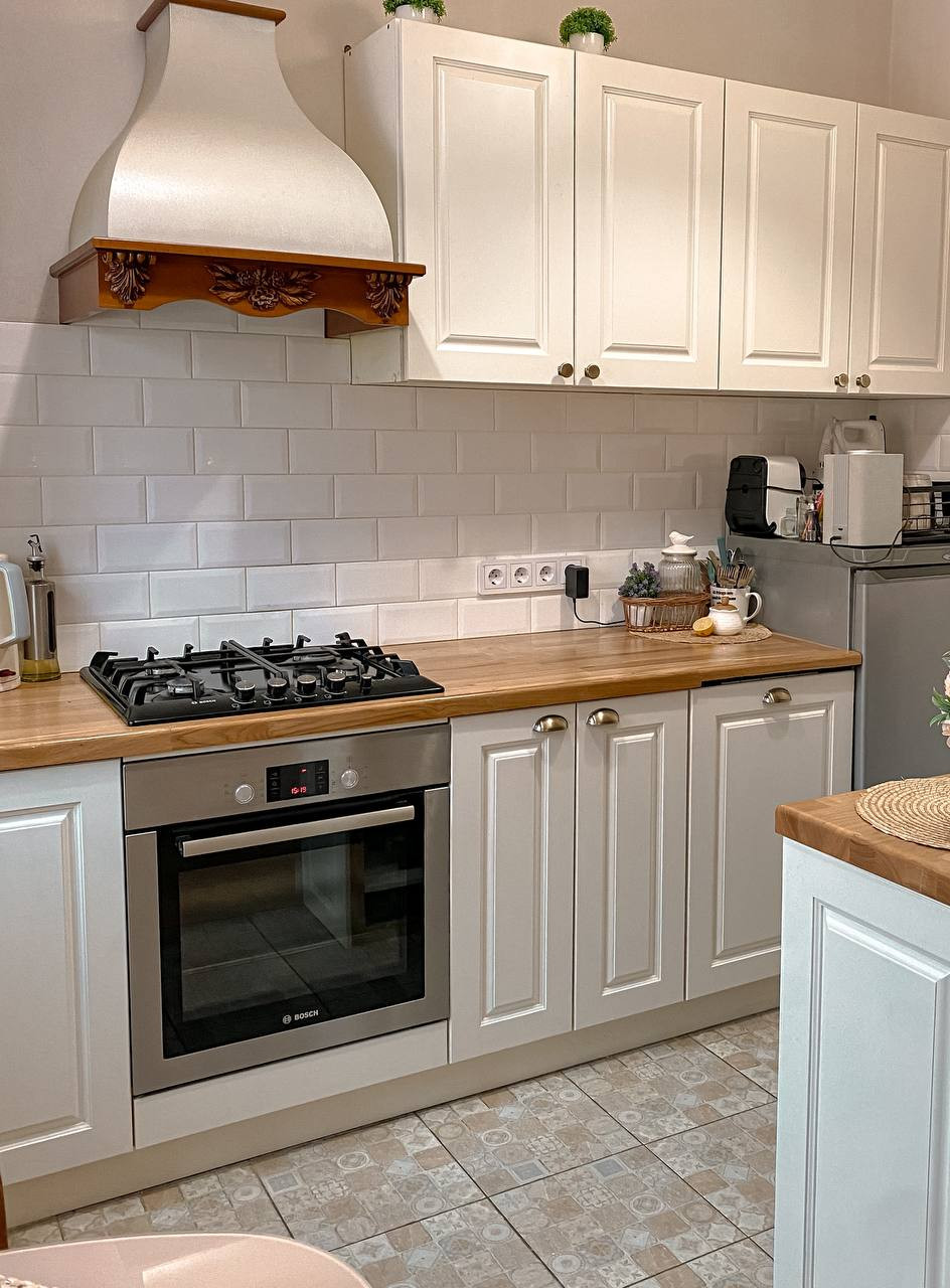 Столешницы из ясеня, фасады МДФ под эмалью, и лаком. Раковина камень, плита фирмы Воsсh.