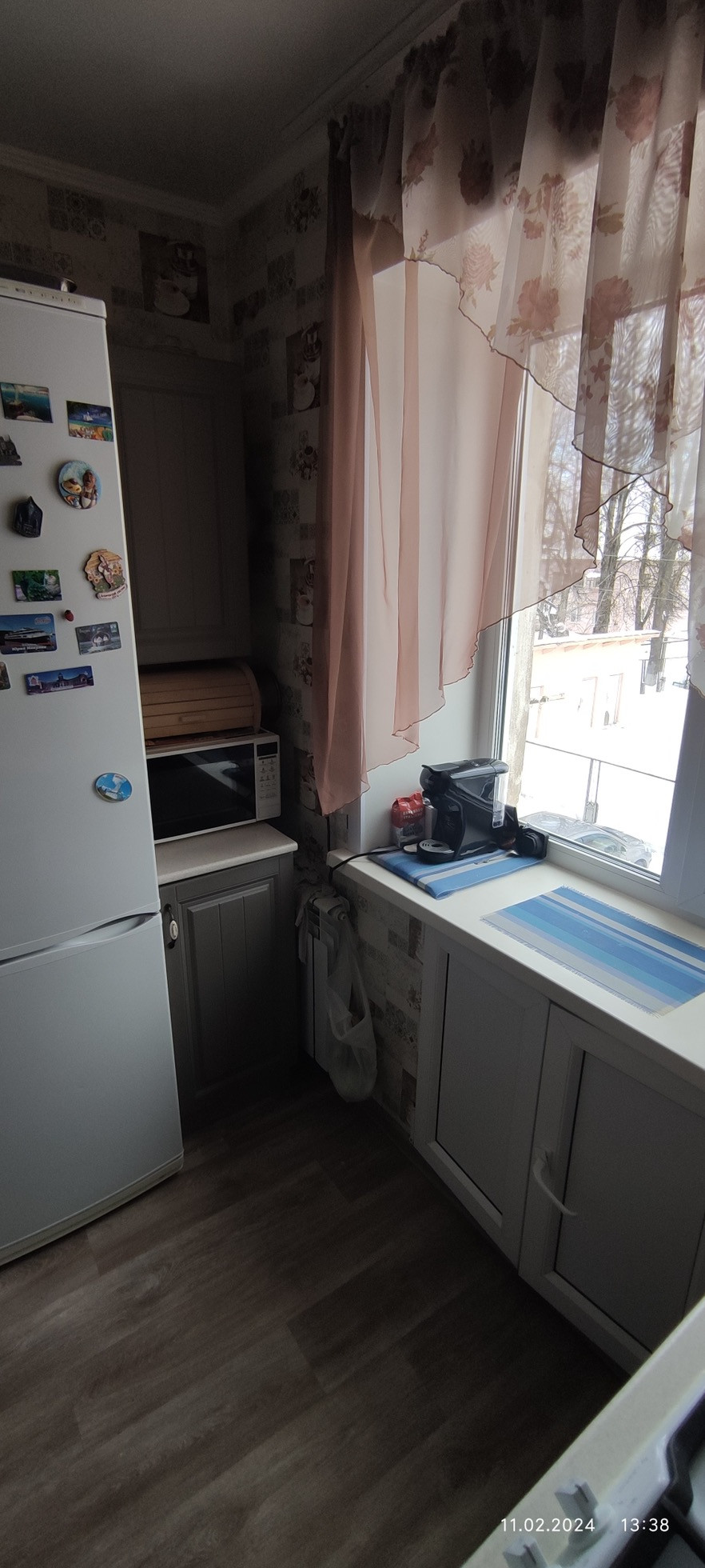 На кухне остается встроенная мебель со встроенной варочной поверхностью и духовым шкафом, «хрущевский холодильник» сохранен и отделан, газовая колонка автомат.